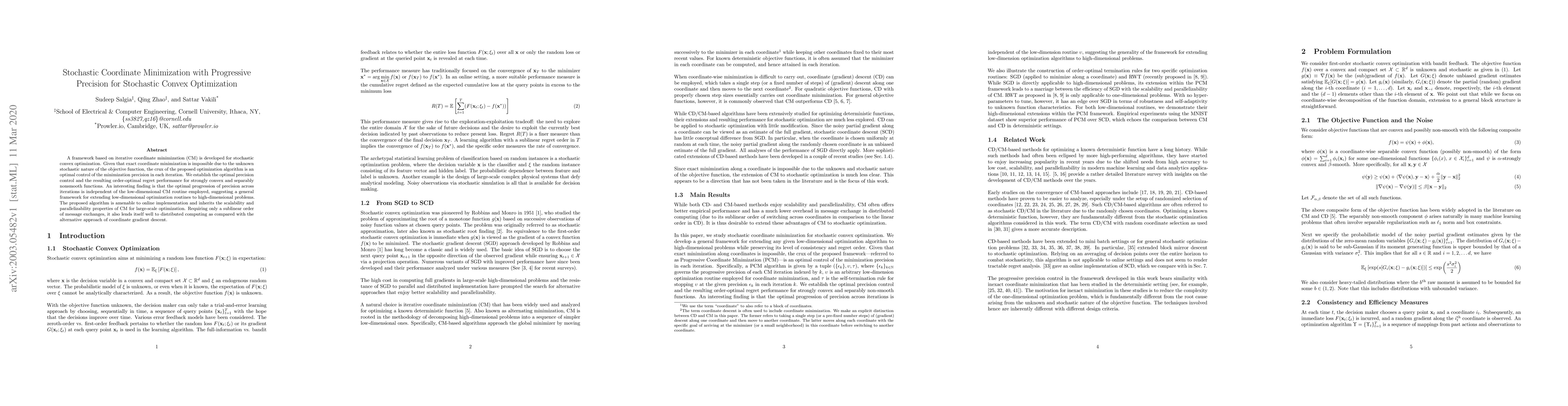 A framework based on iterative coordinate minimization (CM) is developed for stochastic convex optimization. Given that exact coordinate minimization is impossible due to the unknown stochastic nature of the objective function, the crux of the proposed optimization algorithm is an optimal control of the minimization precision in each iteration. We establish the optimal precision control and the resulting order-optimal regret performance for strongly convex and separably nonsmooth functions. An interesting finding is that the optimal progression of precision across iterations is independent of the low-dimensional CM routine employed, suggesting a general framework for extending low-dimensional optimization routines to high-dimensional problems. The proposed algorithm is amenable to online implementation and inherits the scalability and parallelizability properties of CM for large-scale optimization. Requiring only a sublinear order of message exchanges, it also lends itself well to distributed computing as compared with the alternative approach of coordinate gradient descent.