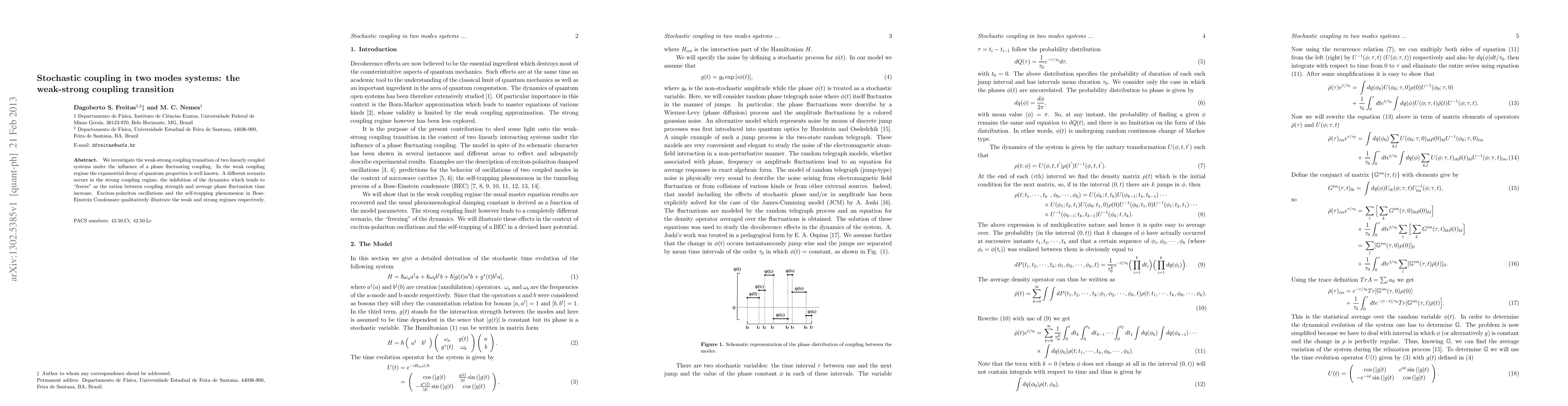 This paper explores the transition between weak and strong coupling in two linearly coupled quantum systems influenced by fluctuating phase coupling. In the weak coupling regime, quantum properties decay exponentially, while in the strong coupling regime, dynamics are inhibited and "freeze" as coupling strength increases relative to phase fluctuation time.