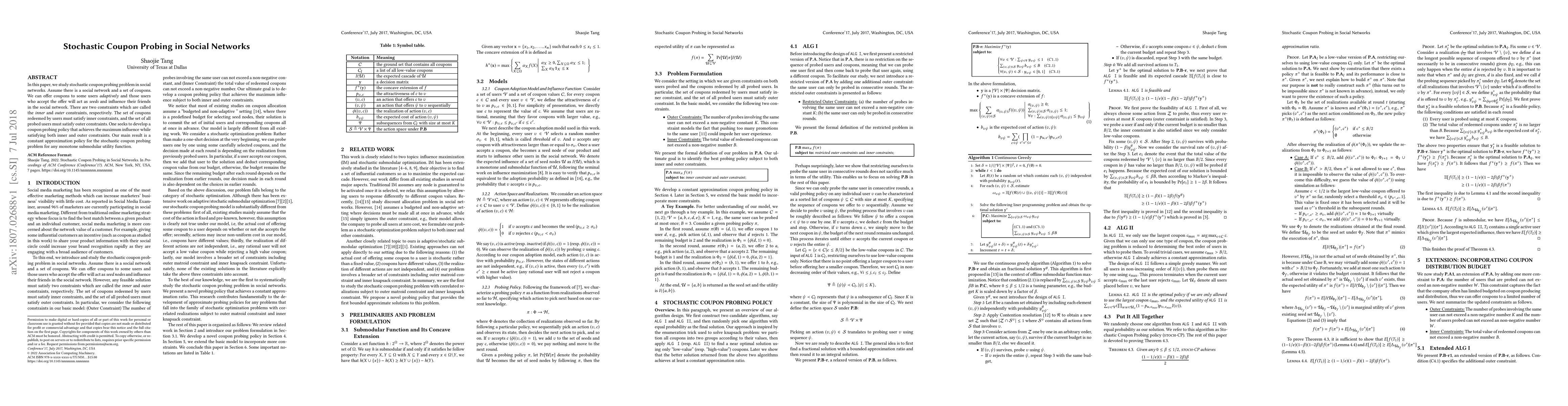 This paper investigates the stochastic coupon probing problem in social networks, where coupons are offered to users to act as seeds influencing their friends. The goal is to maximize influence while adhering to inner and outer constraints on coupon redemption and probed users. The authors propose a constant approximation policy for achieving maximum influence under any monotone submodular utility function.