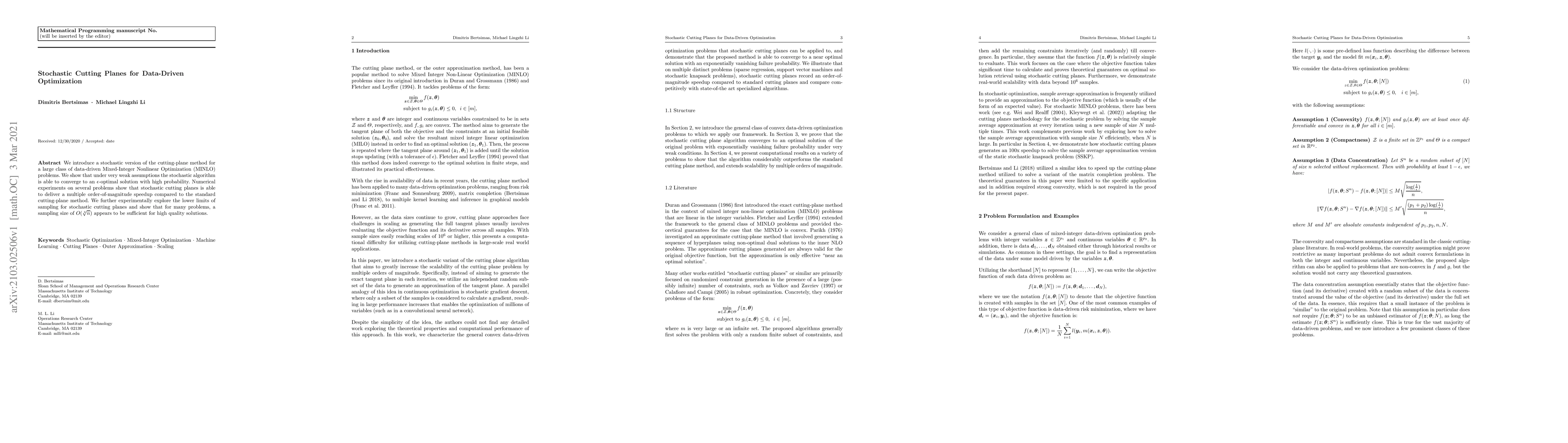 We introduce a stochastic version of the cutting-plane method for a large class of data-driven Mixed-Integer Nonlinear Optimization (MINLO) problems. We show that under very weak assumptions the stochastic algorithm is able to converge to an $\epsilon$-optimal solution with high probability. Numerical experiments on several problems show that stochastic cutting planes is able to deliver a multiple order-of-magnitude speedup compared to the standard cutting-plane method. We further experimentally explore the lower limits of sampling for stochastic cutting planes and show that for many problems, a sampling size of $O(\sqrt[3]{n})$ appears to be sufficient for high quality solutions.