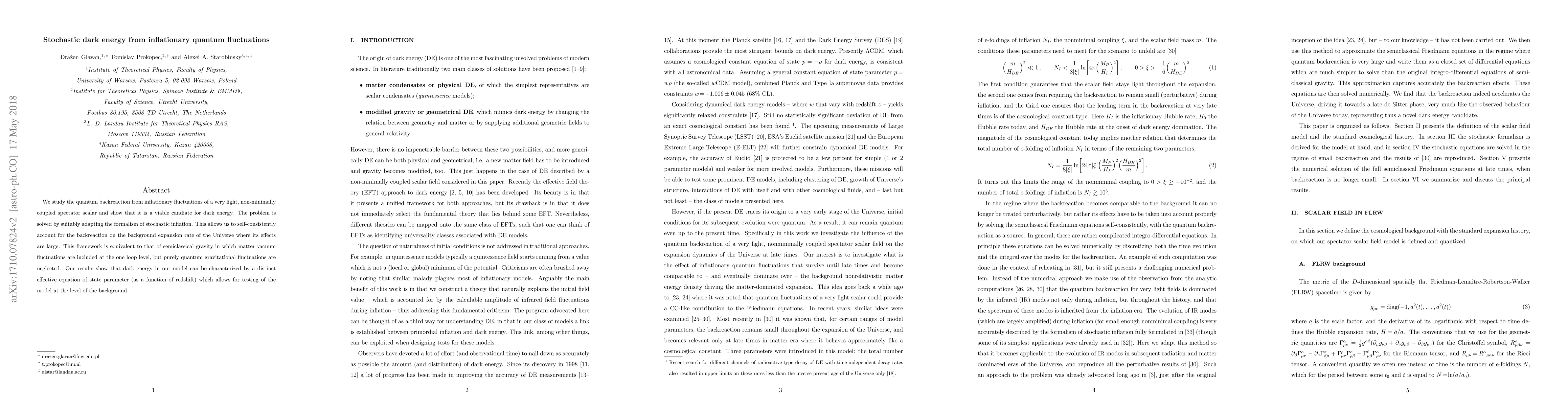 This paper explores how quantum fluctuations from an inflationary light scalar field can generate a viable dark energy candidate through quantum backreaction, using a stochastic inflation framework. The study finds an effective equation of state parameter for dark energy, enabling potential observational tests.