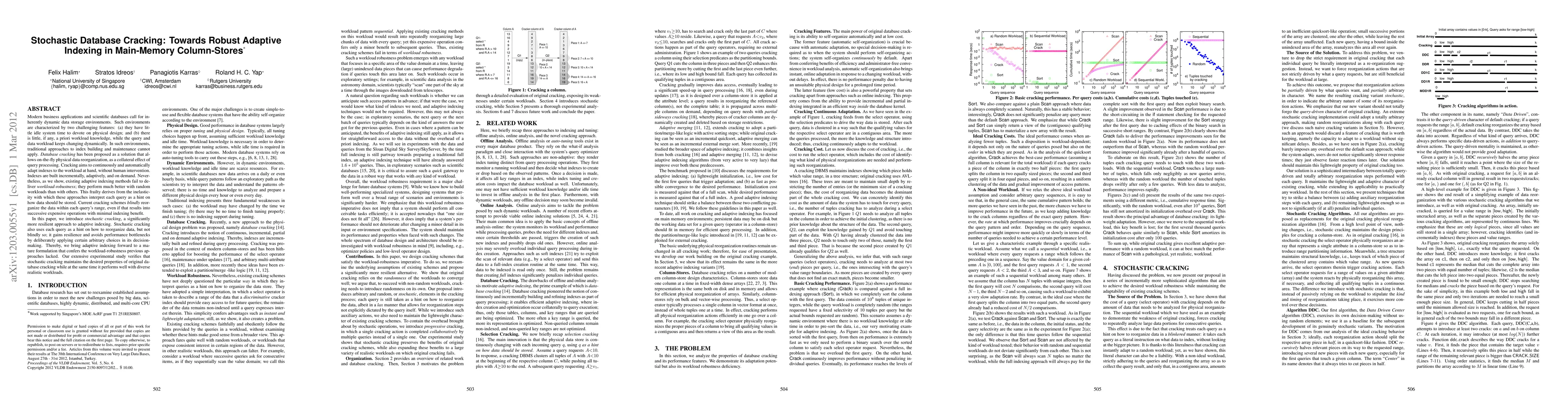 This paper proposes stochastic cracking as an adaptive indexing method for main-memory column-stores, addressing the limitations of existing adaptive indexing approaches that lack workload-robustness. Stochastic cracking introduces deliberate randomness in data reorganization to avoid performance bottlenecks, achieving better performance across diverse workloads.