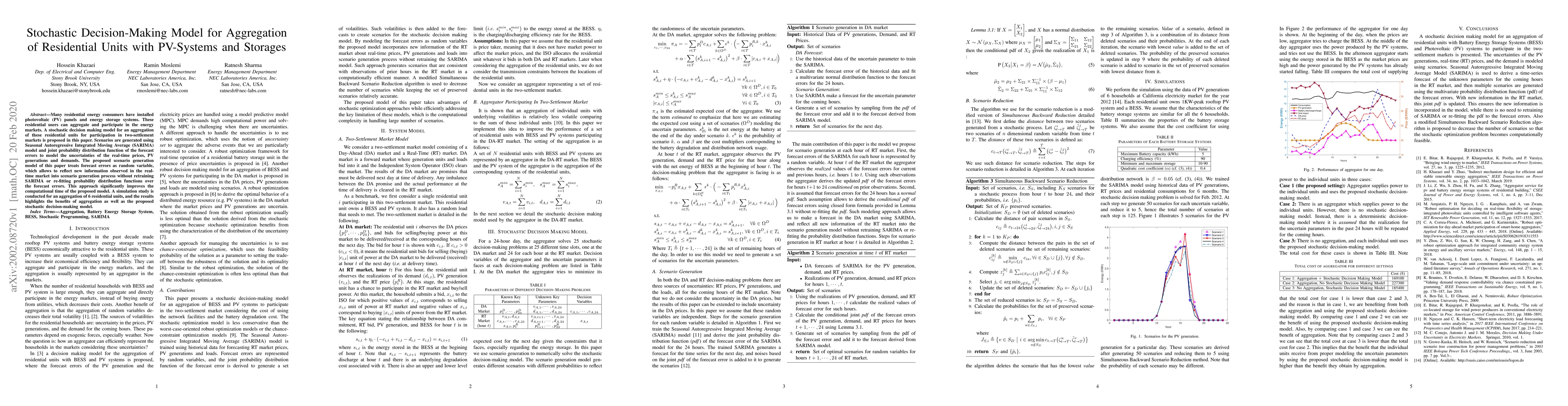 The paper proposes a stochastic decision-making model for aggregating residential units with PV systems and storages to participate in energy markets. It utilizes a SARIMA model and joint probability distribution functions for scenario generation, enhancing computational efficiency by treating forecast errors as random variables.