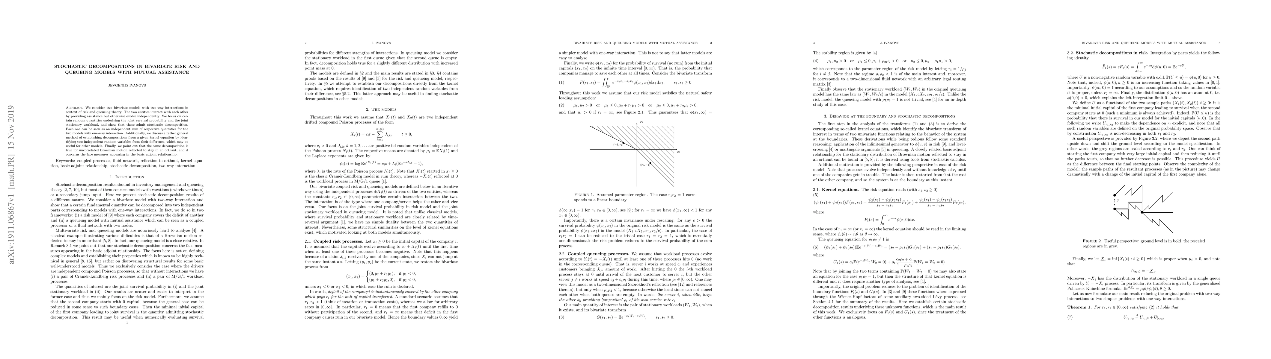 We consider two bivariate models with two-way interactions in context of risk and queueing theory. The two entities interact with each other by providing assistance but otherwise evolve independently. We focus on certain random quantities underlying the joint survival probability and the joint stationary workload, and show that these admit stochastic decomposition. Each one can be seen as an independent sum of respective quantities for the two models with one-way interaction. Additionally, we discuss a rather general method of establishing decompositions from a given kernel equation by identifying two independent random variables from their difference, which may be useful for other models. Finally, we point out that the same decomposition is true for uncorrelated Brownian motion reflected to stay in an orthant, and it concerns the face measures appearing in the basic adjoint relationship.