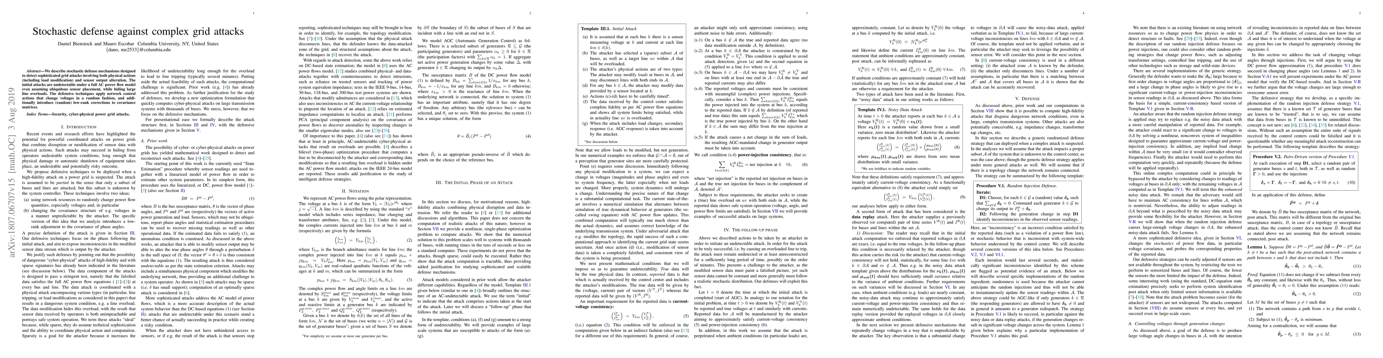 We describe defense mechanisms designed to detect sophisticated grid attacks involving both physical actions (including load modification) and sensor output alteration, with the latter performed in a sparse manner and also so as to take into account grid response mechanisms (secondary response). The attacks aim to be both undetectable even under a full AC power flow model, and to hide equipment overload. We demonstrate that such attacks, while perhaps difficult to implement, nevertheless are easily computed even on systems with a large number of installed sensors, and can, in a static setting, successfuly hide large line overloads. Furthermore an attacker that understands the ongoing stochastic nature of sensor signals can extend the attack so as to remain effective for a nontrivial time period. To counteract such "ideal" or "perfect" attacks, we demonstrate a set of data-driven stochastic techniques to thwart the attacker and detect that an attack has taken place.
