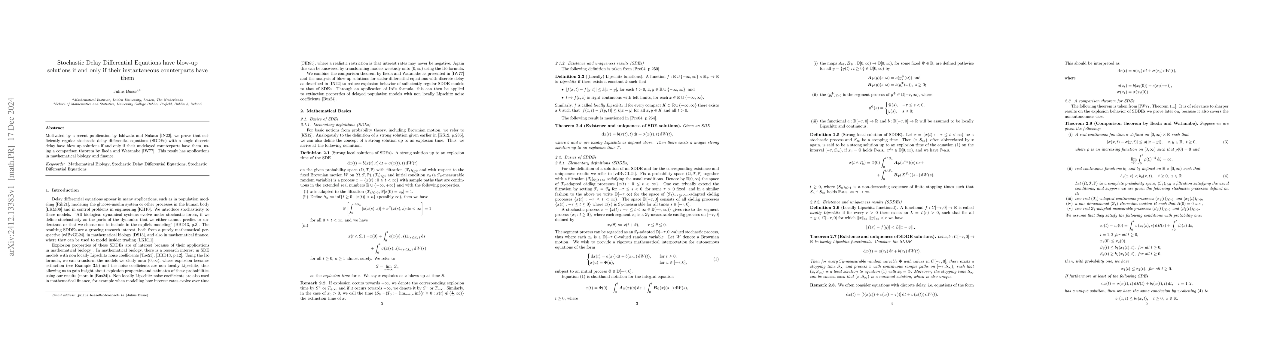 Summary: We prove that stochastic delay differential equations (SDDEs) have blow-up solutions if and only if their instantaneous counterparts do, using a comparison theorem. This finding has implications for mathematical biology and finance.
