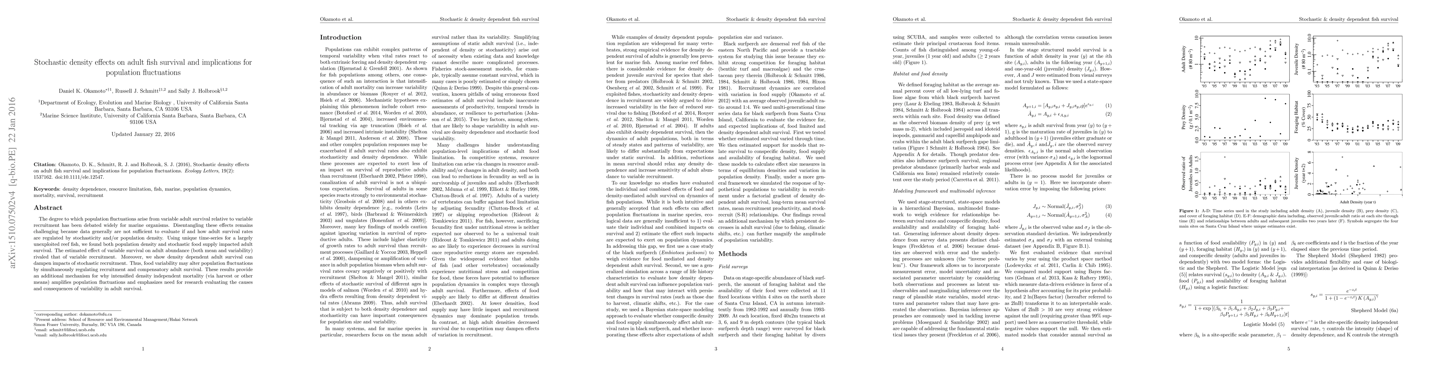 This study reveals that both stochastic food supply and population density significantly impact adult fish survival, with variable adult survival effects on population abundance comparable to those of variable recruitment. The findings suggest that density-dependent adult survival can mitigate the effects of stochastic recruitment, highlighting the importance of understanding adult survival variability in managing population fluctuations.