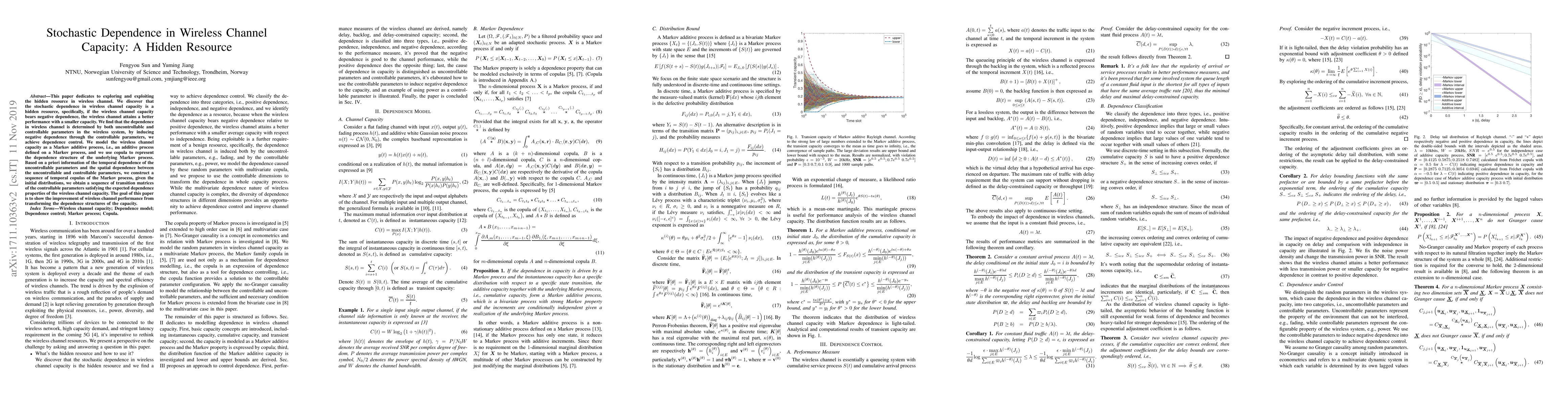 This paper dedicates to exploring and exploiting the hidden resource in wireless channel. We discover that the stochastic dependence in wireless channel capacity is a hidden resource, specifically, if the wireless channel capacity bears negative dependence, the wireless channel attains a better performance with a smaller capacity. We find that the dependence in wireless channel is determined by both uncontrollable and controllable parameters in the wireless system, by inducing negative dependence through the controllable parameters, we achieve dependence control. We model the wireless channel capacity as a Markov additive process, i.e., an additive process defined on a Markov process, and we use copula to represent the dependence structure of the underlying Markov process. Based on a priori information of the temporal dependence of the uncontrollable parameters and the spatial dependence between the uncontrollable and controllable parameters, we construct a sequence of temporal copulas of the Markov process, given the initial distributions, we obtain a sequence of transition matrices of the controllable parameters satisfying the expected dependence properties of the wireless channel capacity. The goal of this paper is to show the improvement of wireless channel performance from transforming the dependence structures of the capacity.