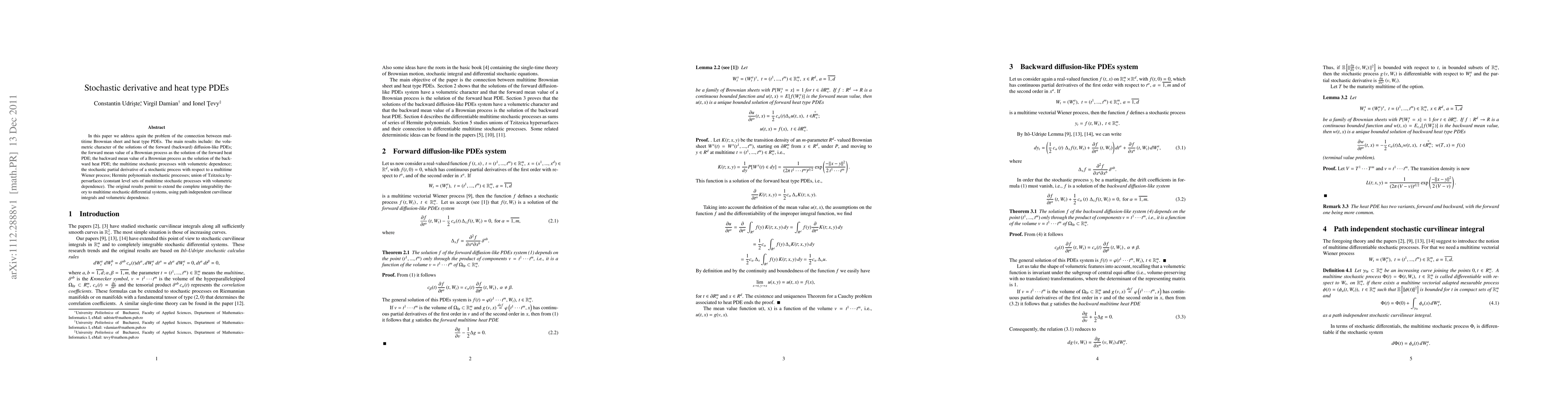 In this paper we address again the problem of the connection between multitime Brownian sheet and heat type PDEs. The main results include: the volumetric character of the solutions of the forward (backward) diffusion-like PDEs; the forward mean value of a Brownian process as the solution of the forward heat PDE; the backward mean value of a Brownian process as the solution of the backward heat PDE; the multitime stochastic processes with volumetric dependence; the stochastic partial derivative of a stochastic process with respect to a multitime Wiener process; Hermite polynomials stochastic processes; union of Tzitzeica hypersurfaces (constant level sets of multitime stochastic processes with volumetric dependence). The original results permit to extend the complete integrability theory to multitime stochastic differential systems, using path independent curvilinear integrals and volumetric dependence.
