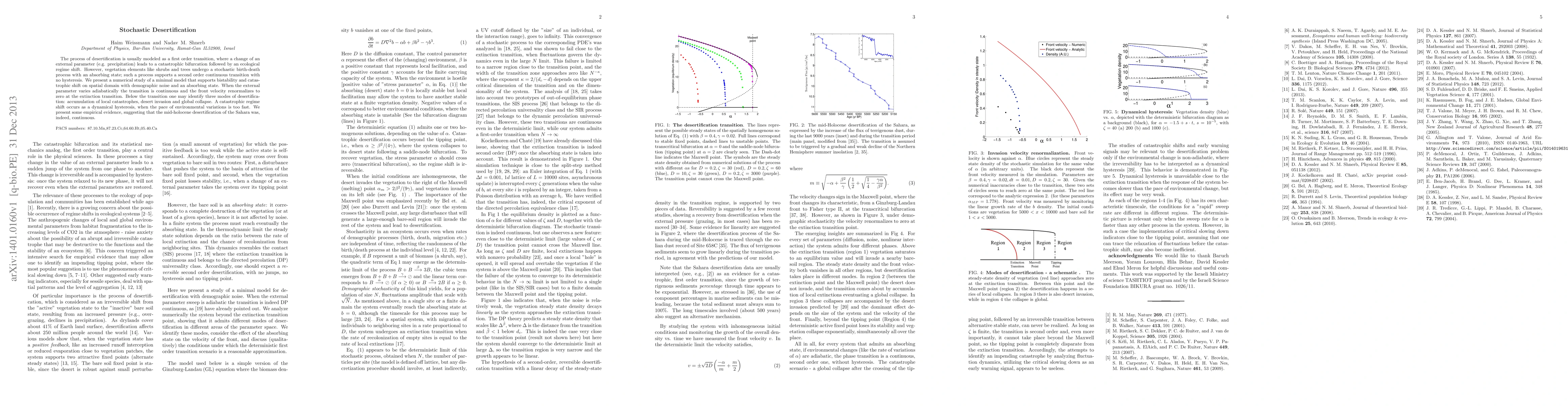 The process of desertification is usually modeled as a first order transition, where a change of an external parameter (e.g. precipitation) leads to a catastrophic bifurcation followed by an ecological regime shift. However, vegetation elements like shrubs and trees undergo a stochastic birth-death process with an absorbing state; such a process supports a second order continuous transition with no hysteresis. We present a numerical study of a minimal model that supports bistability and catastrophic shift on spatial domain with demographic noise and an absorbing state. When the external parameter varies adiabatically the transition is continuous and the front velocity renormalizes to zero at the extinction transition. Below the transition one may identify three modes of desertification: accumulation of local catastrophes, desert invasion and global collapse. A catastrophic regime shift occurs as a dynamical hysteresis, when the pace of environmental variations is too fast. We present some empirical evidence, suggesting that the mid-holocene desertification of the Sahara was, indeed, continuous.