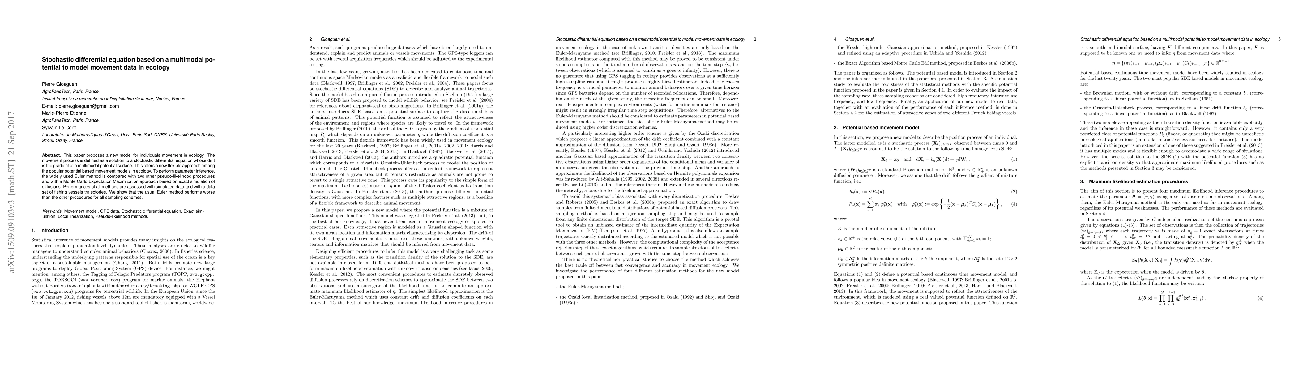 This paper introduces a stochastic differential equation model for ecological movement data, where the drift is derived from a multimodal potential surface. It compares the performance of the Euler method with pseudo-likelihood and Monte Carlo Expectation Maximization approaches for parameter inference, demonstrating that the latter two methods outperform the Euler method.