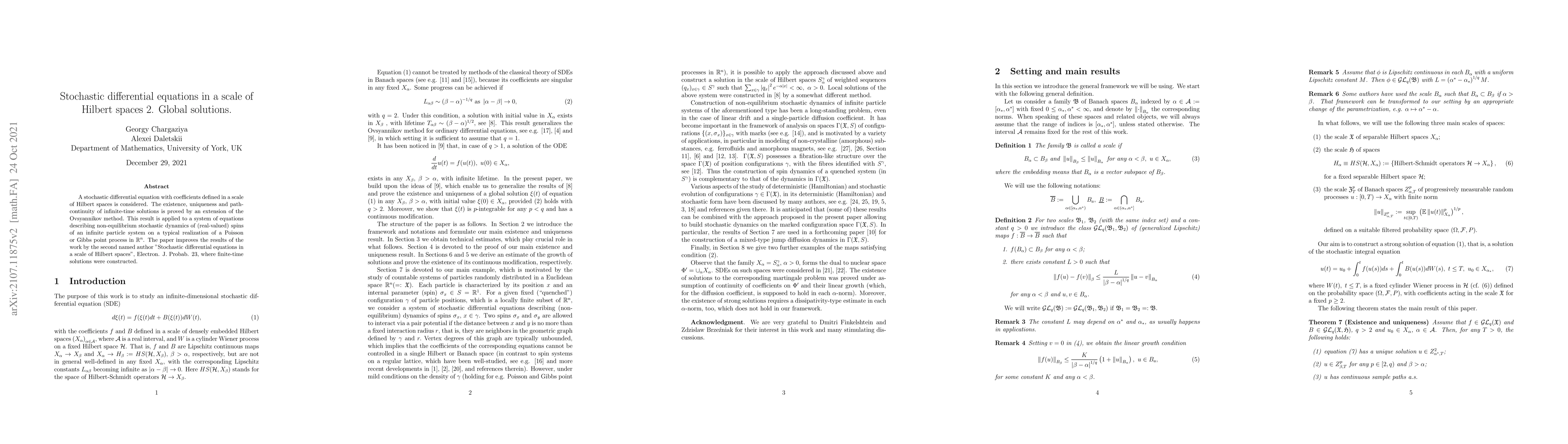 This paper proves the existence, uniqueness, and path-continuity of global solutions for stochastic differential equations defined in a scale of Hilbert spaces, extending the Ovsyannikov method. The results are applied to a system modeling non-equilibrium stochastic dynamics of spins on a Poisson or Gibbs point process.