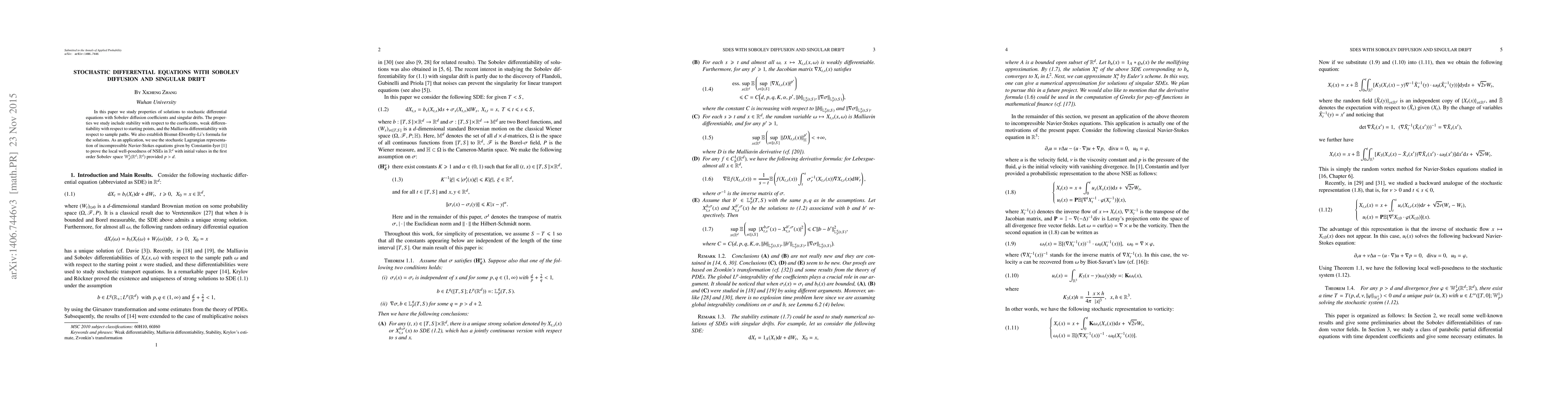 This paper investigates the properties of solutions to stochastic differential equations with Sobolev diffusion and singular drifts, focusing on stability, weak differentiability, and Malliavin differentiability. It establishes Bismut-Elworthy-Li's formula and applies the findings to prove local well-posedness for incompressible Navier-Stokes equations in $\mR^d$ with initial data in $\mW^1_p(\mR^d;\mR^d)$ for $p>d$.