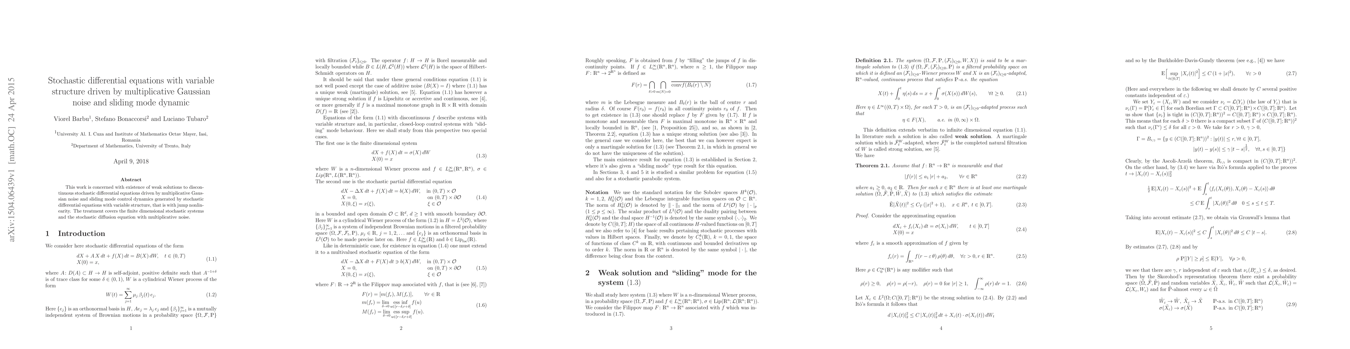 This paper investigates the existence of weak solutions for discontinuous stochastic differential equations driven by multiplicative Gaussian noise and sliding mode control dynamics, focusing on finite-dimensional systems and stochastic diffusion equations with variable structure.