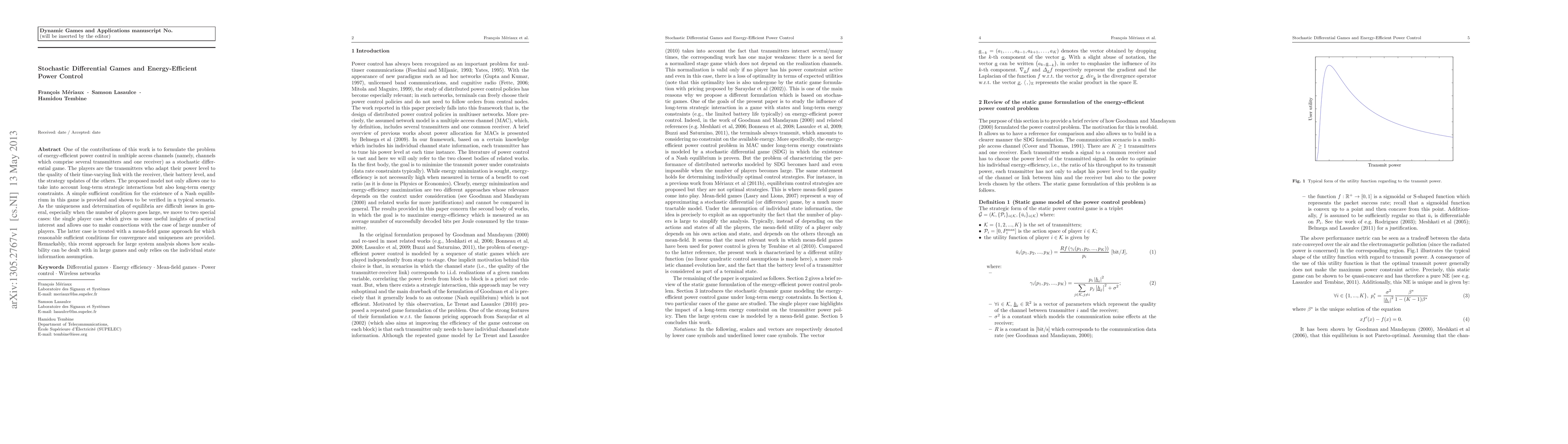 One of the contributions of this work is to formulate the problem of energy-efficient power control in multiple access channels (namely, channels which comprise several transmitters and one receiver) as a stochastic differential game. The players are the transmitters who adapt their power level to the quality of their time-varying link with the receiver, their battery level, and the strategy updates of the others. The proposed model not only allows one to take into account long-term strategic interactions but also long-term energy constraints. A simple sufficient condition for the existence of a Nash equilibrium in this game is provided and shown to be verified in a typical scenario. As the uniqueness and determination of equilibria are difficult issues in general, especially when the number of players goes large, we move to two special cases: the single player case which gives us some useful insights of practical interest and allows one to make connections with the case of large number of players. The latter case is treated with a mean-field game approach for which reasonable sufficient conditions for convergence and uniqueness are provided. Remarkably, this recent approach for large system analysis shows how scalability can be dealt with in large games and only relies on the individual state information assumption.
