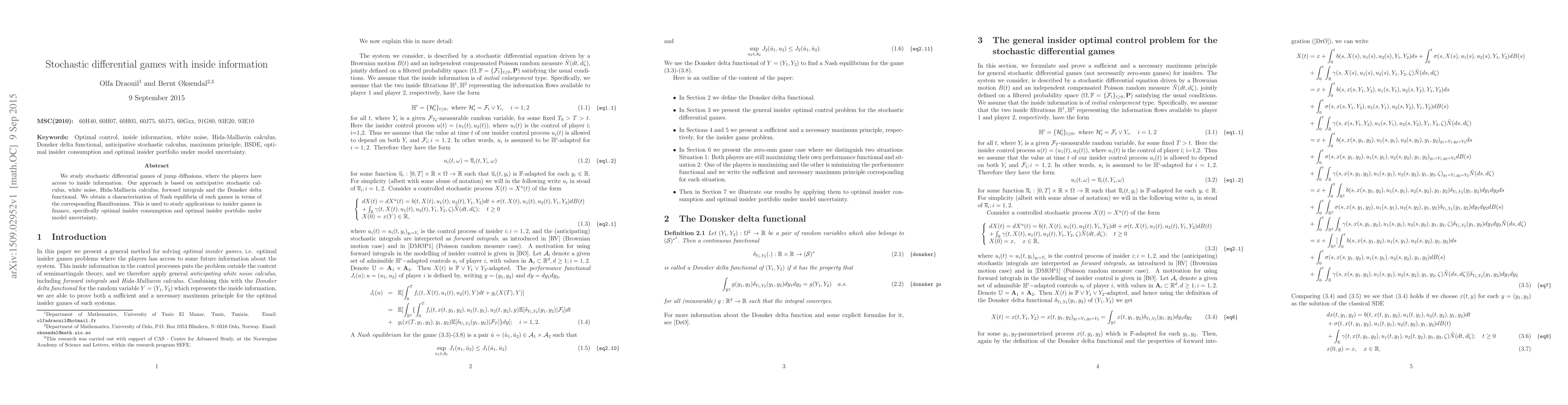This paper explores stochastic differential games involving jump diffusions where players possess insider information, utilizing anticipative stochastic calculus and advanced techniques to characterize Nash equilibria. Applications focus on insider trading scenarios in finance, addressing optimal insider consumption and portfolio strategies under model uncertainty.