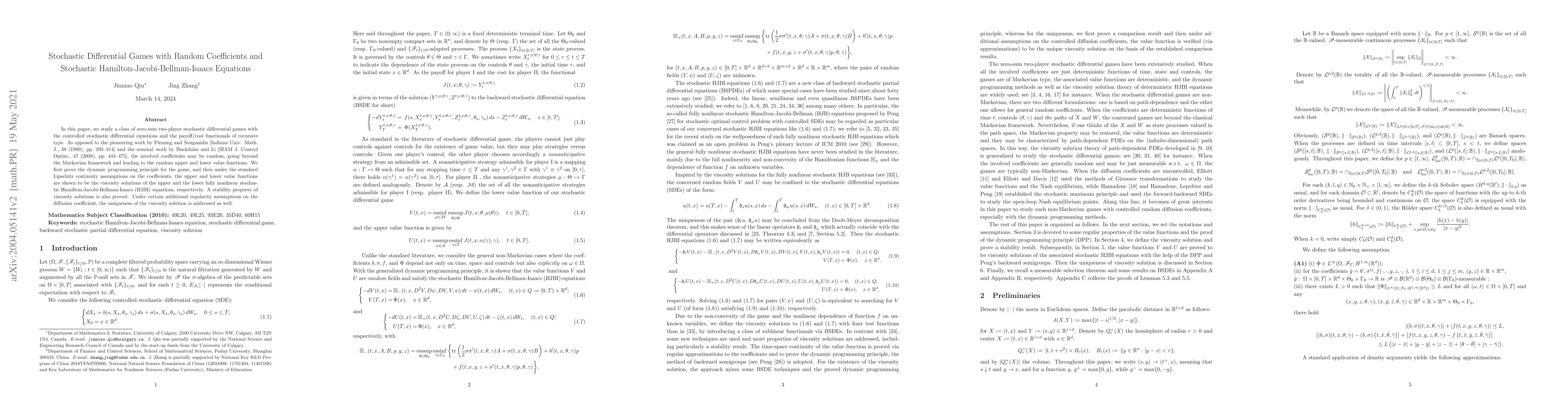 This paper investigates zero-sum stochastic differential games with random coefficients, extending beyond Markovian frameworks. It proves the dynamic programming principle and shows that the upper and lower value functions are viscosity solutions to the corresponding stochastic Hamilton-Jacobi-Bellman-Isaacs equations, with additional stability and uniqueness results under specific conditions.