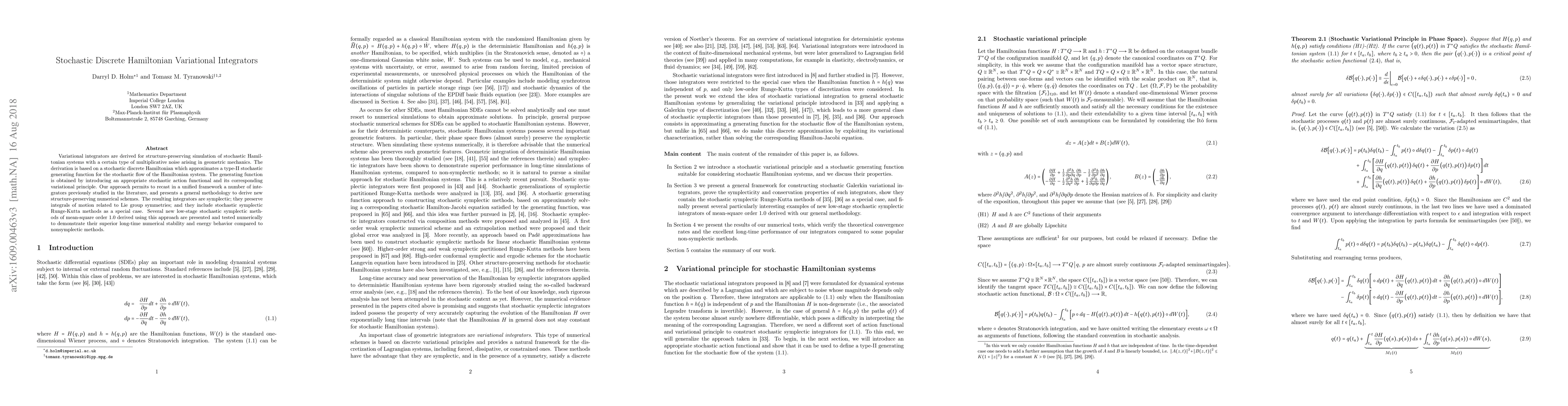 This paper develops variational integrators for stochastic Hamiltonian systems with multiplicative noise, presenting a unified framework for deriving symplectic methods that preserve Lie group symmetries and include stochastic symplectic Runge-Kutta methods. New low-stage stochastic symplectic methods of mean-square order 1.0 demonstrate superior long-time stability and energy behavior compared to nonsymplectic methods.