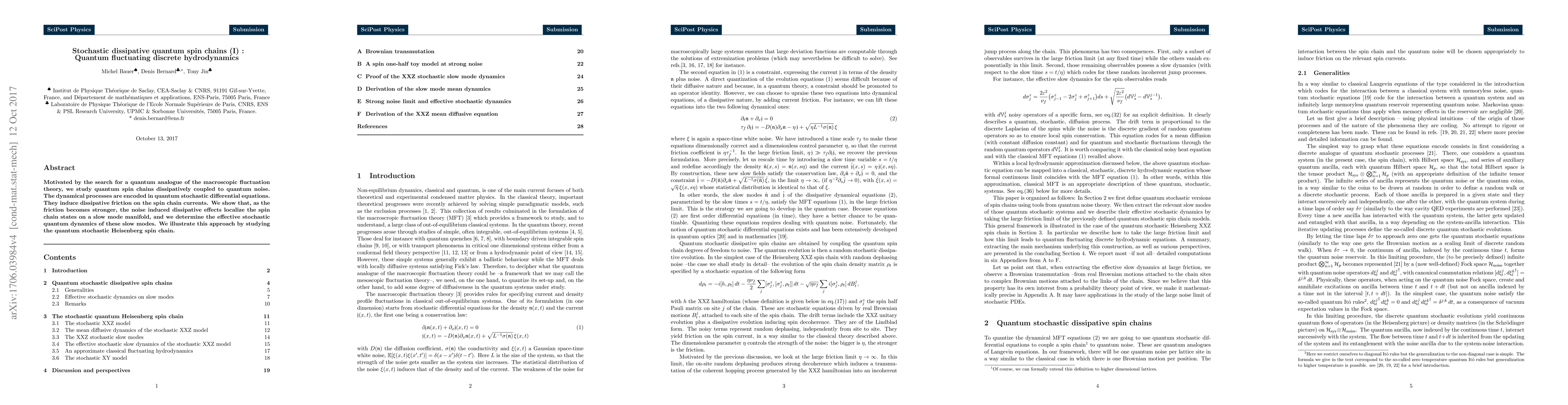 Motivated by the search for a quantum analogue of the macroscopic fluctuation theory, we study quantum spin chains dissipatively coupled to quantum noise. The dynamical processes are encoded in quantum stochastic differential equations. They induce dissipative friction on the spin chain currents. We show that, as the friction becomes stronger, the noise induced dissipative effects localize the spin chain states on a slow mode manifold, and we determine the effective stochastic quantum dynamics of these slow modes. We illustrate this approach by studying the quantum stochastic Heisenberg spin chain.
