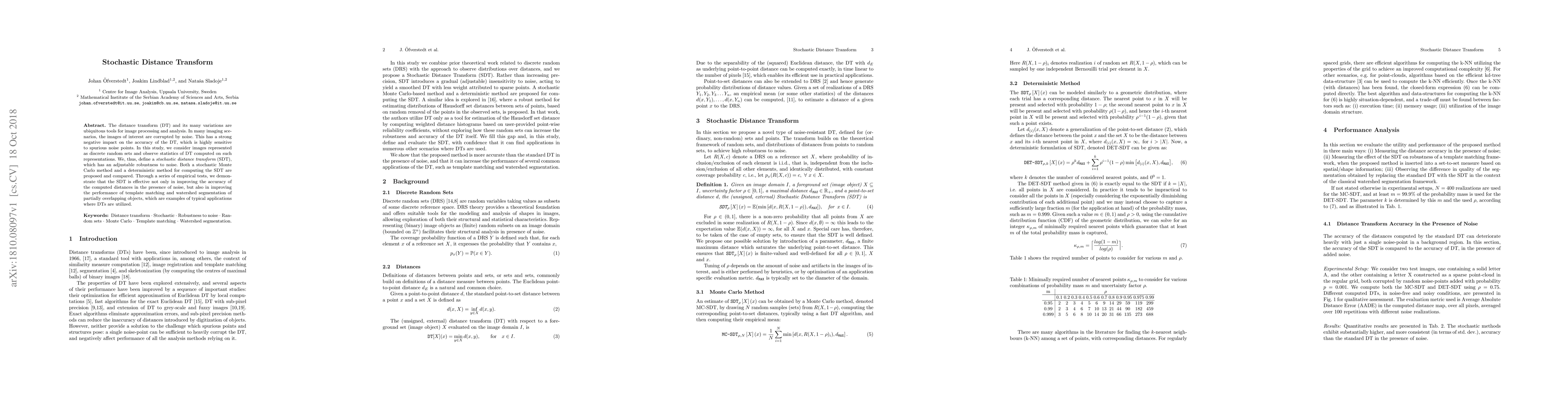 The distance transform (DT) and its many variations are ubiquitous tools for image processing and analysis. In many imaging scenarios, the images of interest are corrupted by noise. This has a strong negative impact on the accuracy of the DT, which is highly sensitive to spurious noise points. In this study, we consider images represented as discrete random sets and observe statistics of DT computed on such representations. We, thus, define a stochastic distance transform (SDT), which has an adjustable robustness to noise. Both a stochastic Monte Carlo method and a deterministic method for computing the SDT are proposed and compared. Through a series of empirical tests, we demonstrate that the SDT is effective not only in improving the accuracy of the computed distances in the presence of noise, but also in improving the performance of template matching and watershed segmentation of partially overlapping objects, which are examples of typical applications where DTs are utilized.
