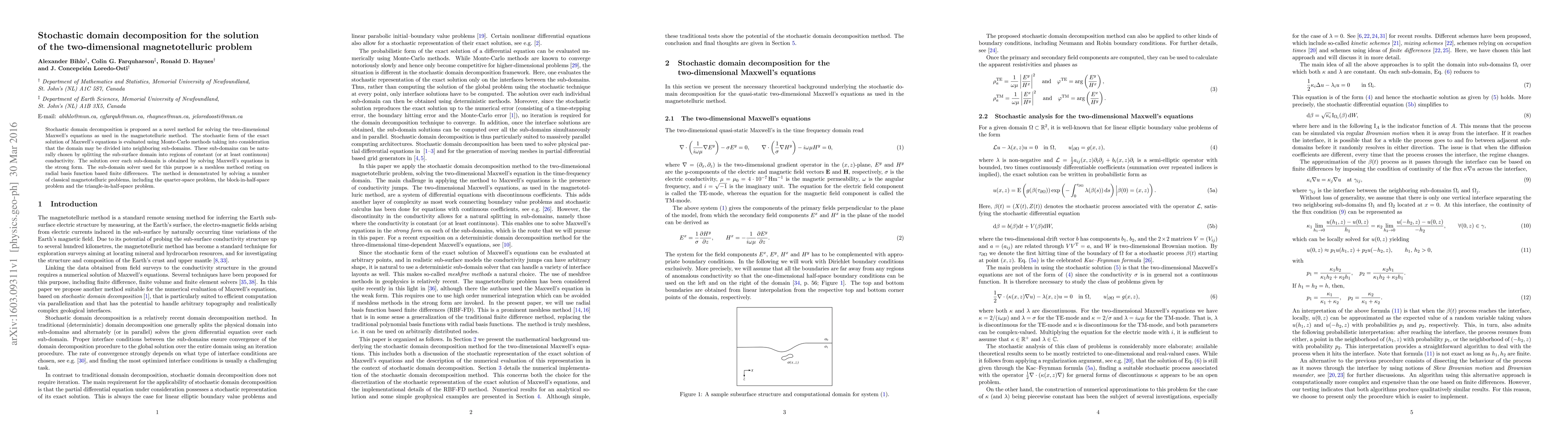 Stochastic domain decomposition is proposed as a novel method for solving the two-dimensional Maxwell's equations as used in the magnetotelluric method. The stochastic form of the exact solution of Maxwell's equations is evaluated using Monte-Carlo methods taking into consideration that the domain may be divided into neighboring sub-domains. These sub-domains can be naturally chosen by splitting the sub-surface domain into regions of constant (or at least continuous) conductivity. The solution over each sub-domain is obtained by solving Maxwell's equations in the strong form. The sub-domain solver used for this purpose is a meshless method resting on radial basis function based finite differences. The method is demonstrated by solving a number of classical magnetotelluric problems, including the quarter-space problem, the block-in-half-space problem and the triangle-in-half-space problem.