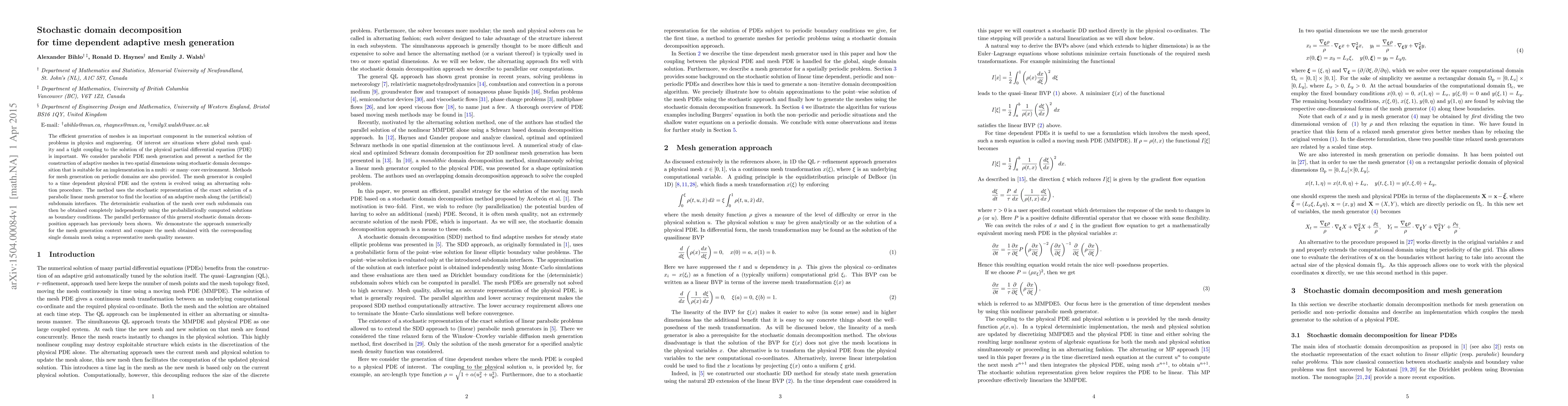 This paper presents a stochastic domain decomposition method for adaptive mesh generation in two dimensions for solving parabolic PDEs, emphasizing parallel efficiency and mesh quality. The method uses probabilistic solutions to determine adaptive mesh locations and demonstrates its effectiveness through numerical comparison with single domain meshes.