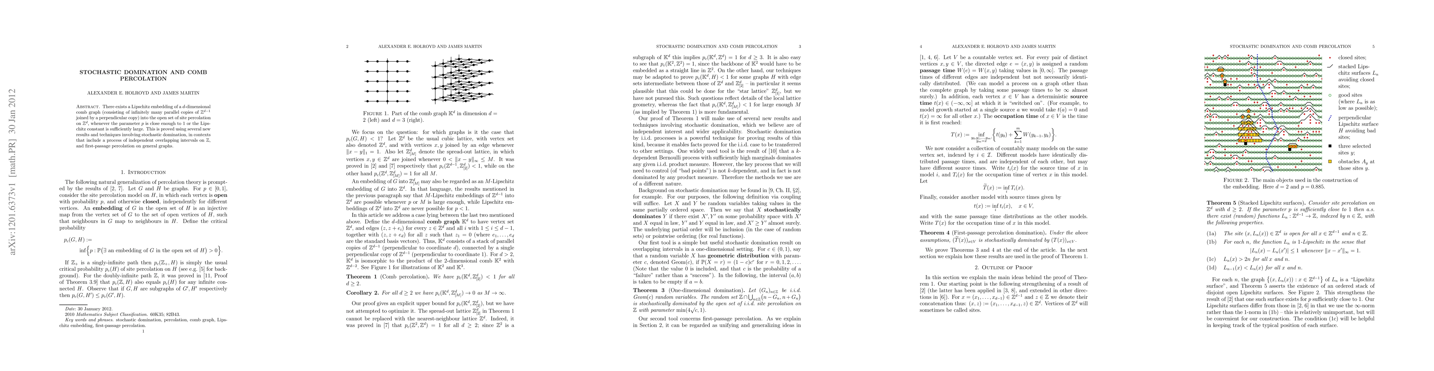 There exists a Lipschitz embedding of a d-dimensional comb graph (consisting of infinitely many parallel copies of Z^{d-1} joined by a perpendicular copy) into the open set of site percolation on Z^d, whenever the parameter p is close enough to 1 or the Lipschitz constant is sufficiently large. This is proved using several new results and techniques involving stochastic domination, in contexts that include a process of independent overlapping intervals on Z, and first-passage percolation on general graphs.