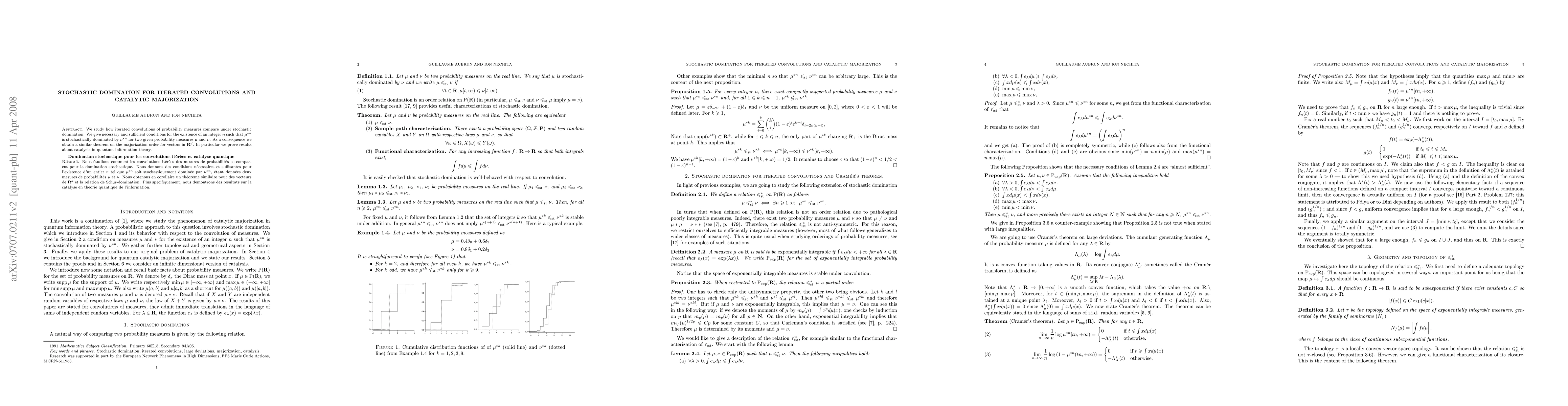 We study how iterated convolutions of probability measures compare under stochastic domination. We give necessary and sufficient conditions for the existence of an integer $n$ such that $\mu^{*n}$ is stochastically dominated by $\nu^{*n}$ for two given probability measures $\mu$ and $\nu$. As a consequence we obtain a similar theorem on the majorization order for vectors in $\R^d$. In particular we prove results about catalysis in quantum information theory.