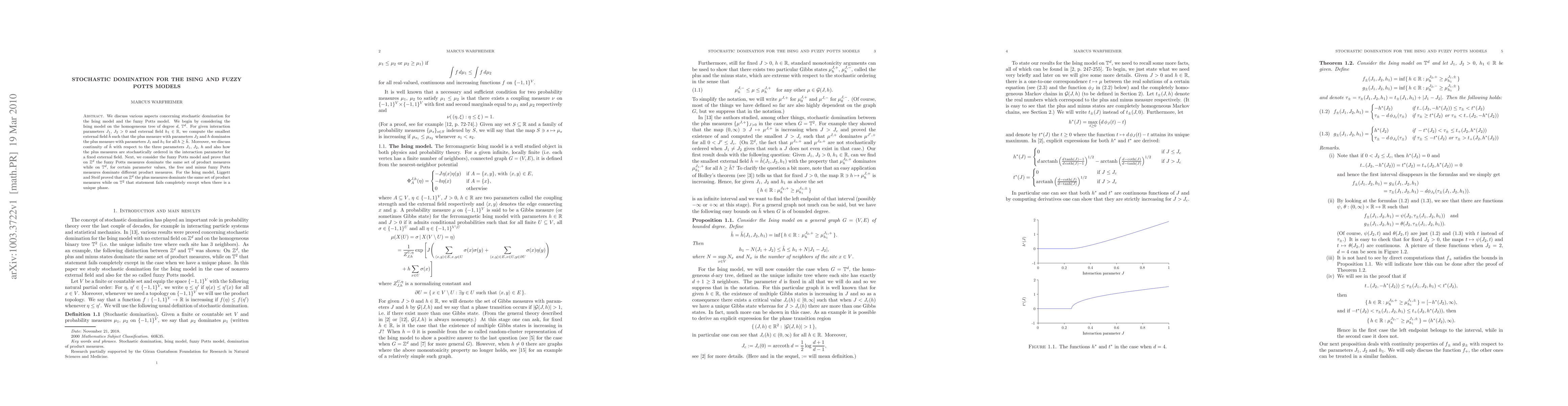 This paper explores stochastic domination in the Ising and fuzzy Potts models, finding that certain plus measures dominate product measures for specific parameter values and external fields, with implications for phase transitions and ordering.