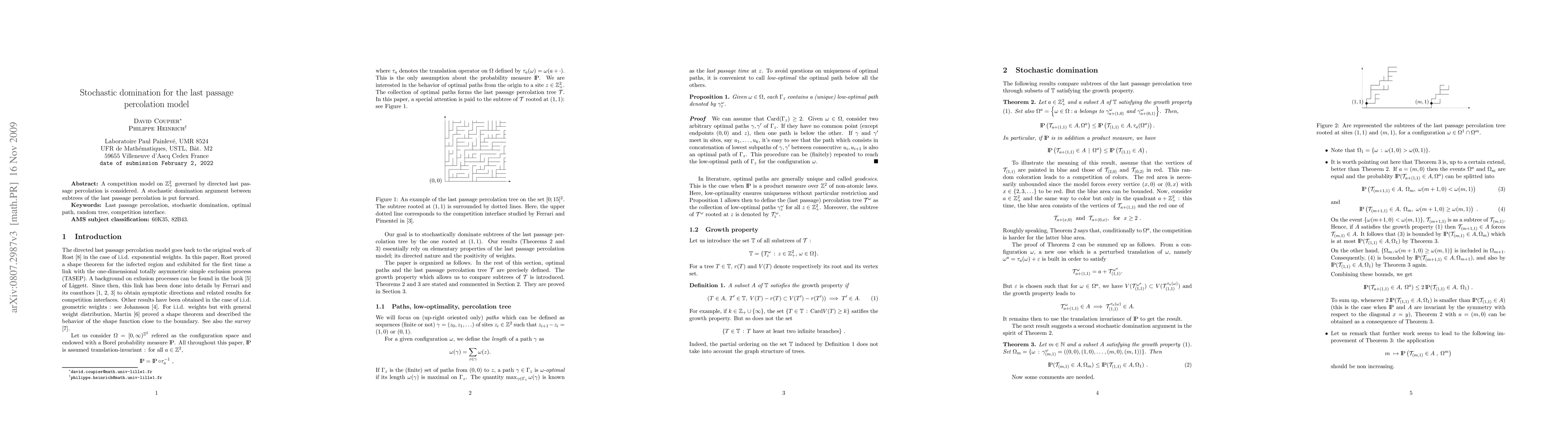 This paper introduces a stochastic domination method to analyze a competition model on $\mathbb{Z}_+^{2}$ through directed last passage percolation, establishing a new way to compare subtrees within the model. The findings provide insights into the structure and behavior of the percolation process.