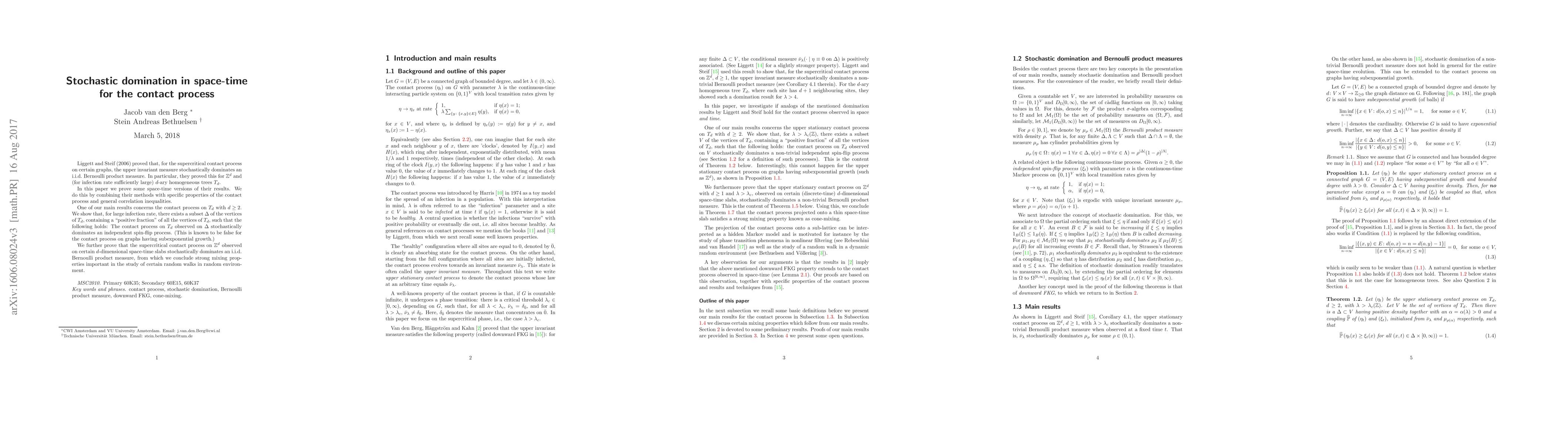 The paper proves that certain space-time versions of the contact process stochastically dominate an independent spin-flip process, leading to strong mixing properties important in studying random walks in random environments.