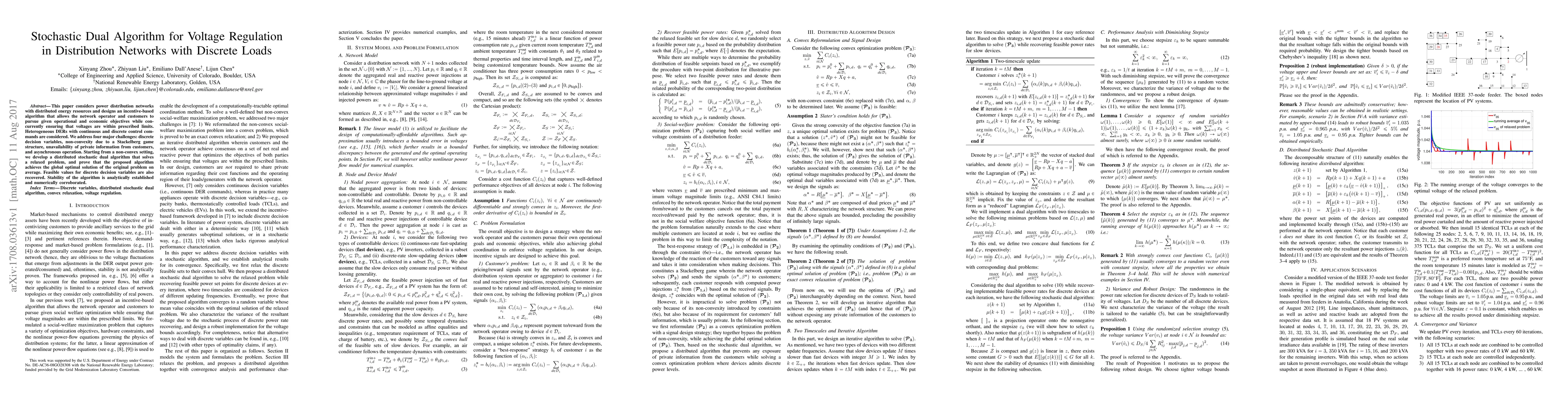 This paper considers power distribution networks with distributed energy resources and designs an incentive-based algorithm that allows the network operator and customers to pursue given operational and economic objectives while concurrently ensuring that voltages are within prescribed limits. Heterogeneous DERs with continuous and discrete control commands are considered. We address four major challenges: discrete decision variables, non-convexity due to a Stackelberg game structure, unavailability of private information from customers, and asynchronous operation. Starting from a non-convex setting, we develop a distributed stochastic dual algorithm that solves a relaxed problem, and prove that the proposed algorithm achieves the global optimal solution of the original problem on average. Feasible values for discrete decision variables are also recovered. Stability of the algorithm is analytically established and numerically corroborated.