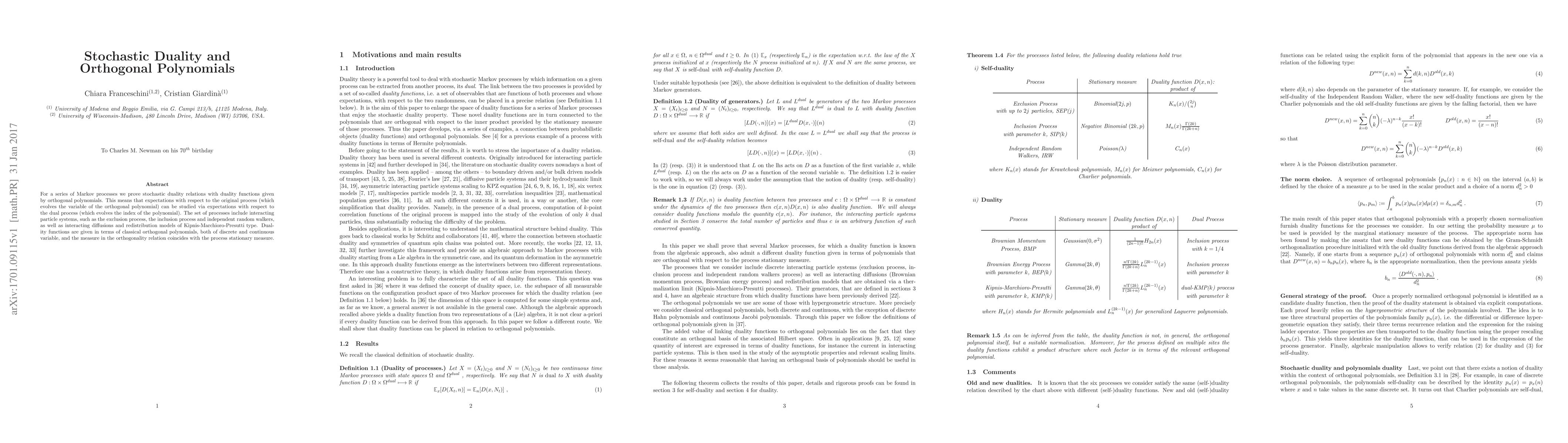 This paper establishes stochastic duality relations for various Markov processes, utilizing orthogonal polynomials as duality functions. The study allows for the analysis of expectations of the original process through those of a dual process, with classical orthogonal polynomials serving as the duality functions.