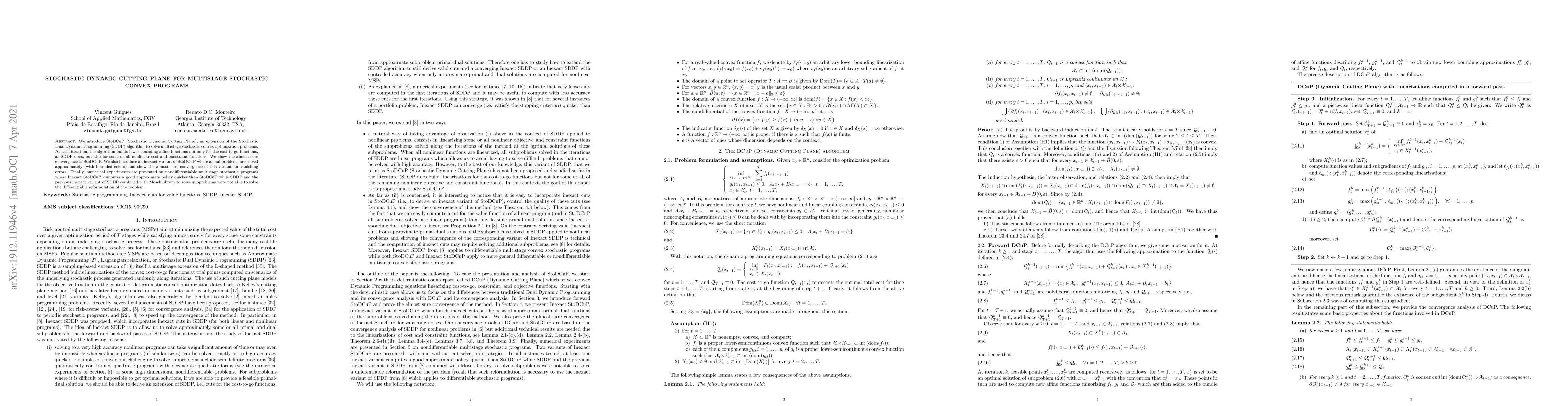 Summary: StoDCuP extends Stochastic Dual Dynamic Programming to solve multistage stochastic convex programs by dynamically constructing lower affine functions for both cost-to-go and nonlinear cost/constraint functions, demonstrating almost sure convergence. An inexact variant with bounded errors also converges almost surely as error diminishes.
