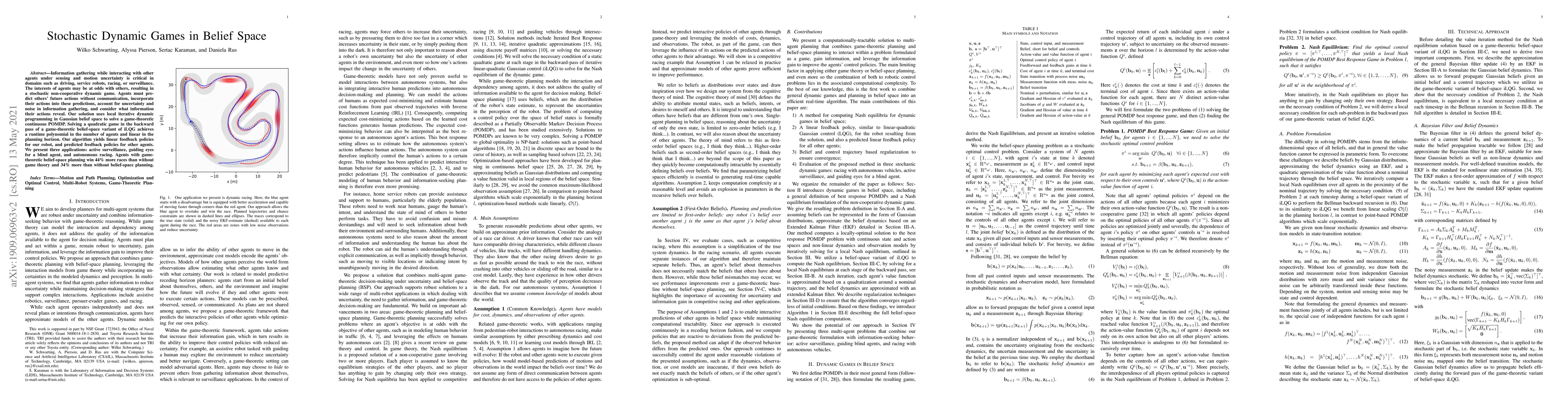 This paper proposes a method for solving stochastic dynamic games in belief space using local iterative dynamic programming, achieving efficient solutions for multi-agent interactions under uncertainty. The approach yields linear feedback policies and improves performance in applications like autonomous racing, where agents using this method win significantly more races.