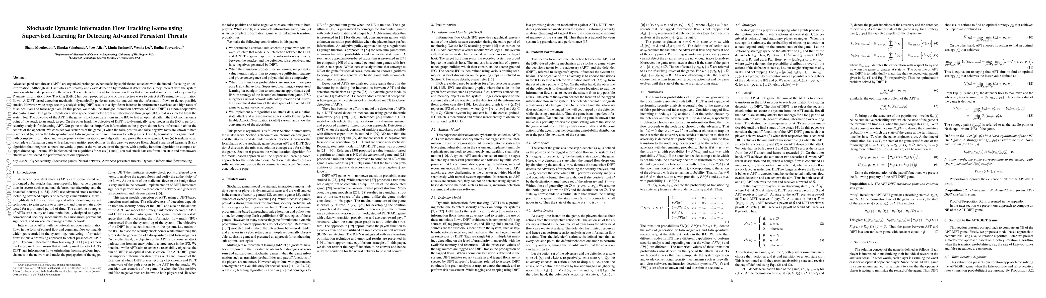 This paper proposes a stochastic dynamic information flow tracking game using supervised learning to detect advanced persistent threats (APTs). The game models APT interactions with system components as a non-cooperative stochastic game, employing value iteration and hierarchical supervised learning to minimize false-positives and false-negatives, validated on real attack datasets.