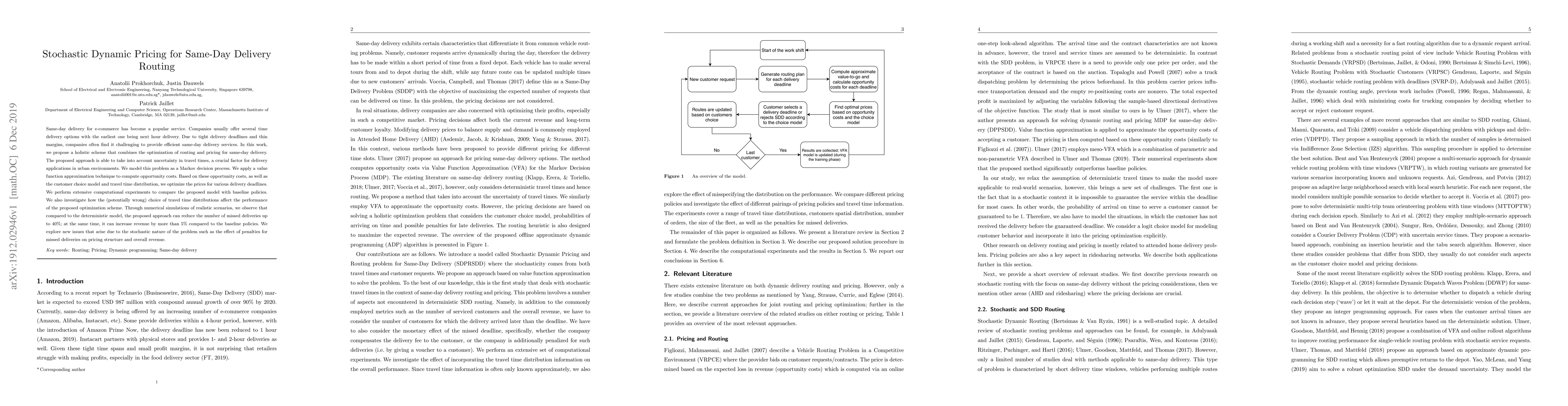 This research proposes a stochastic dynamic pricing model for optimizing same-day delivery routing, addressing uncertainties in travel times through a Markov decision process. The approach optimizes delivery prices based on opportunity costs, customer choice models, and travel time distributions, significantly reducing missed deliveries and increasing revenue compared to deterministic baselines.