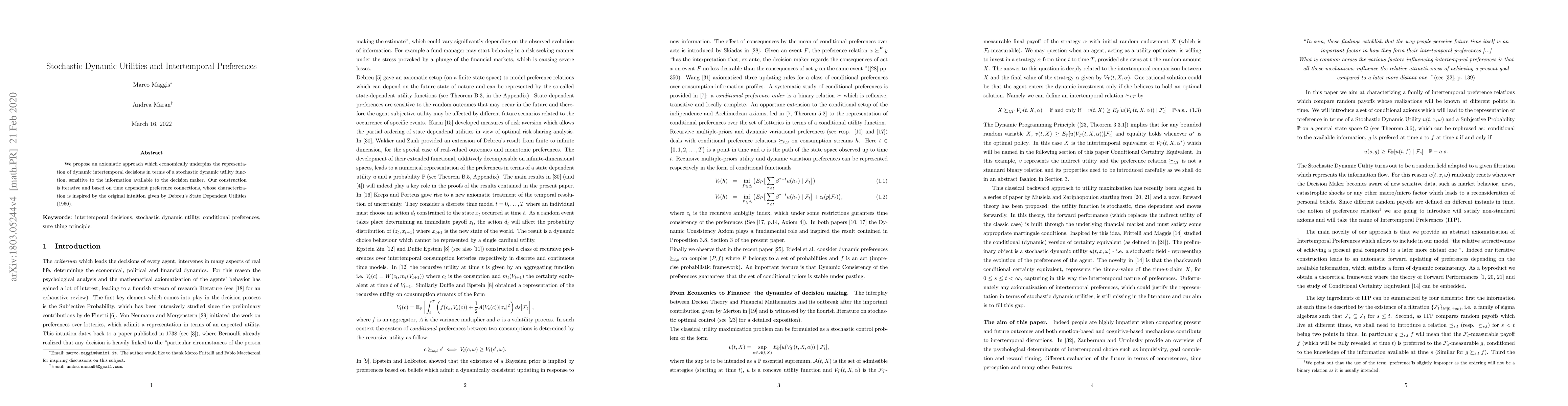 We propose an axiomatic approach which economically underpins the representation of dynamic preferences in terms of a stochastic utility function, sensitive to the information available to the decision maker. Our construction is iterative and based on inter-temporal preference relations, whose characterization is inpired by the original intuition given by Debreu's State Dependent Utilities (1960).