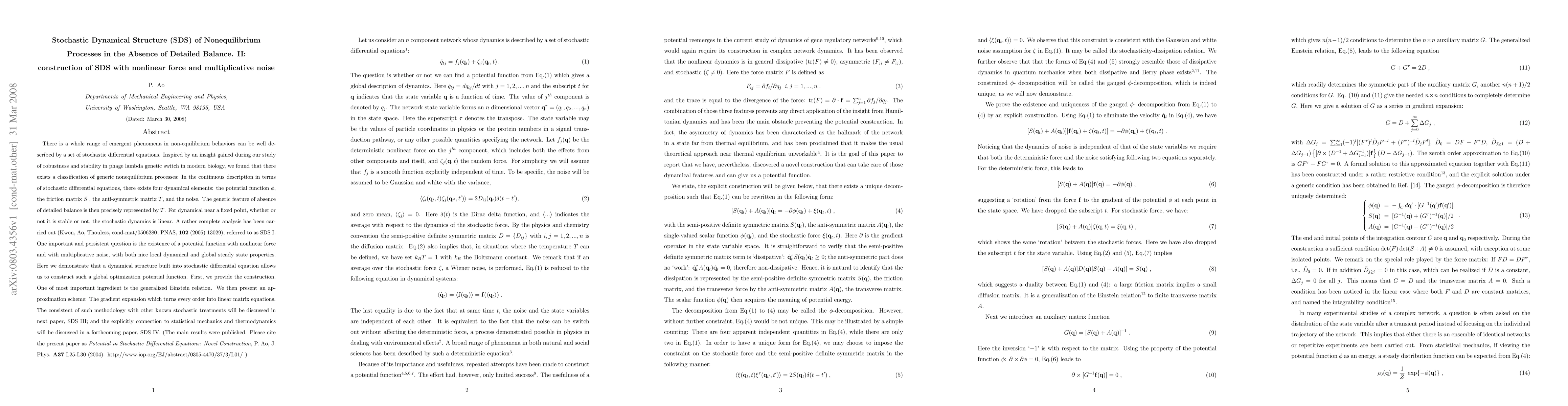 There is a whole range of emergent phenomena in non-equilibrium behaviors can be well described by a set of stochastic differential equations. Inspired by an insight gained during our study of robustness and stability in phage lambda genetic switch in modern biology, we found that there exists a classification of generic nonequilibrium processes: In the continuous description in terms of stochastic differential equations, there exists four dynamical elements: the potential function $\phi$, the friction matrix $ S$, the anti-symmetric matrix $ T $, and the noise. The generic feature of absence of detailed balance is then precisely represented by $T$. For dynamical near a fixed point, whether or not it is stable or not, the stochastic dynamics is linear. A rather complete analysis has been carried out (Kwon, Ao, Thouless, cond-mat/0506280; PNAS, {\bf 102} (2005) 13029), referred to as SDS I. One important and persistent question is the existence of a potential function with nonlinear force and with multiplicative noise, with both nice local dynamical and global steady state properties. Here we demonstrate that a dynamical structure built into stochastic differential equation allows us to construct such a global optimization potential function. First, we provide the construction. One of most important ingredient is the generalized Einstein relation. We then present an approximation scheme: The gradient expansion which turns every order into linear matrix equations. The consistent of such methodology with other known stochastic treatments will be discussed in next paper, SDS III; and the explicitly connection to statistical mechanics and thermodynamics will be discussed in a forthcoming paper, SDS IV.