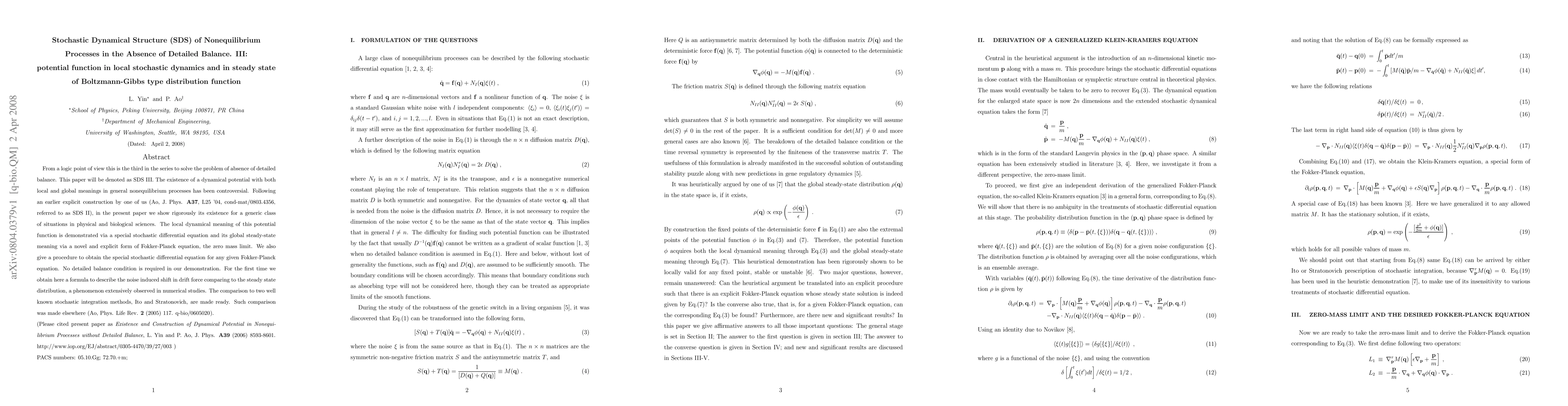 From a logic point of view this is the third in the series to solve the problem of absence of detailed balance. This paper will be denoted as SDS III. The existence of a dynamical potential with both local and global meanings in general nonequilibrium processes has been controversial. Following an earlier explicit construction by one of us (Ao, J. Phys. {\bf A37}, L25 '04, arXiv:0803.4356, referred to as SDS II), in the present paper we show rigorously its existence for a generic class of situations in physical and biological sciences. The local dynamical meaning of this potential function is demonstrated via a special stochastic differential equation and its global steady-state meaning via a novel and explicit form of Fokker-Planck equation, the zero mass limit. We also give a procedure to obtain the special stochastic differential equation for any given Fokker-Planck equation. No detailed balance condition is required in our demonstration. For the first time we obtain here a formula to describe the noise induced shift in drift force comparing to the steady state distribution, a phenomenon extensively observed in numerical studies. The comparison to two well known stochastic integration methods, Ito and Stratonovich, are made ready. Such comparison was made elsewhere (Ao, Phys. Life Rev. {\bf 2} (2005) 117. q-bio/0605020).