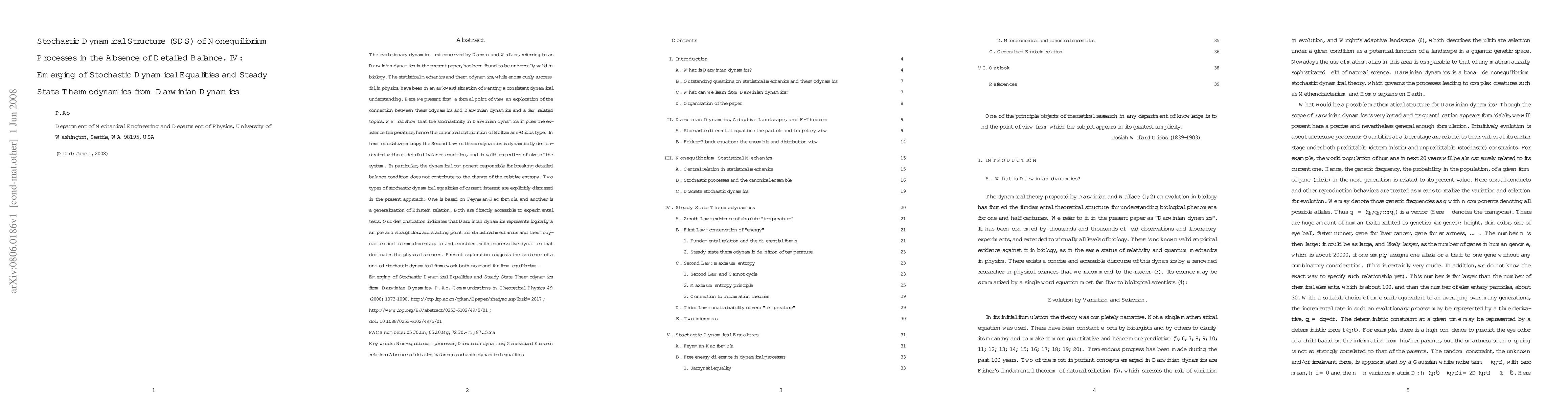 This is the fourth paper, the last one, on solution to the problem of absence of detailed balance in nonequilibrium processes. It is an approach based on another known universal dynamics: The evolutionary dynamics first conceived by Darwin and Wallace, referring to as Darwinian dynamics in the present paper, has been found to be universally valid in biology; The statistical mechanics and thermodynamics, while enormously successful in physics, have been in an awkward situation of wanting a consistent dynamical understanding; Here we present from a formal point of view an exploration of the connection between thermodynamics and Darwinian dynamics and a few related topics. We first show that the stochasticity in Darwinian dynamics implies the existence temperature, hence the canonical distribution of Boltzmann-Gibbs type. In term of relative entropy the Second Law of thermodynamics is dynamically demonstrated without detailed balance condition, and is valid regardless of size of the system. In particular, the dynamical component responsible for breaking detailed balance condition does not contribute to the change of the relative entropy. Two types of stochastic dynamical equalities of current interest are explicitly discussed in the present approach: One is based on Feynman-Kac formula and another is a generalization of Einstein relation. Both are directly accessible to experimental tests. Our demonstration indicates that Darwinian dynamics represents logically a simple and straightforward starting point for statistical mechanics and thermodynamics and is complementary to and consistent with conservative dynamics that dominates the physical sciences. Present exploration suggests the existence of a unified stochastic dynamical framework both near and far from equilibrium.