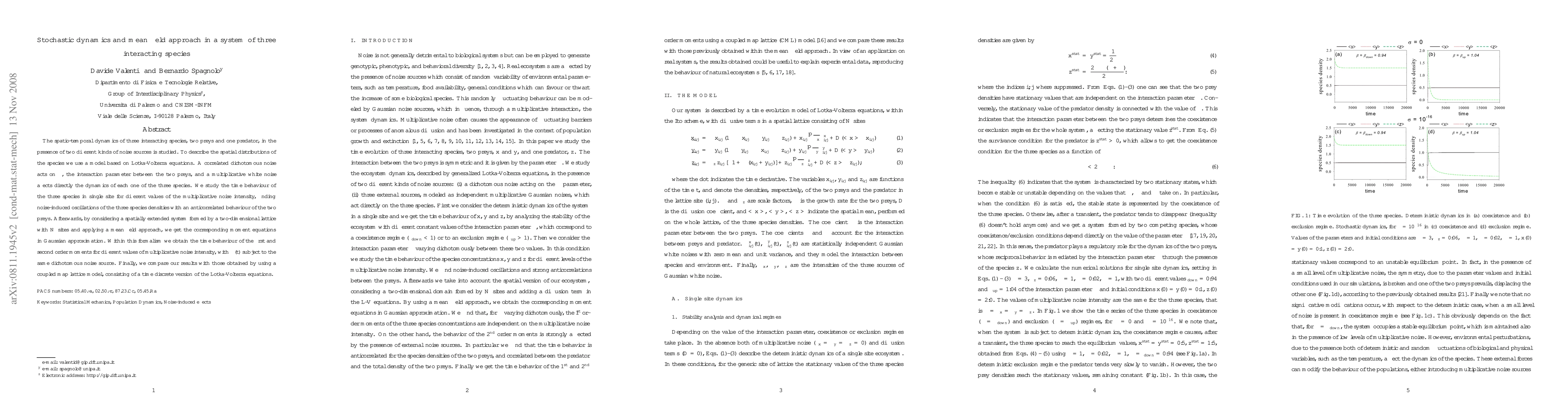 This paper investigates the stochastic dynamics of a three-species system (two preys and one predator) under different noise influences, employing a Lotka-Volterra model. It finds noise-induced oscillations and anticorrelated behavior in prey densities, and uses a mean field approach to study extended spatial systems, comparing results with a coupled map lattice model.