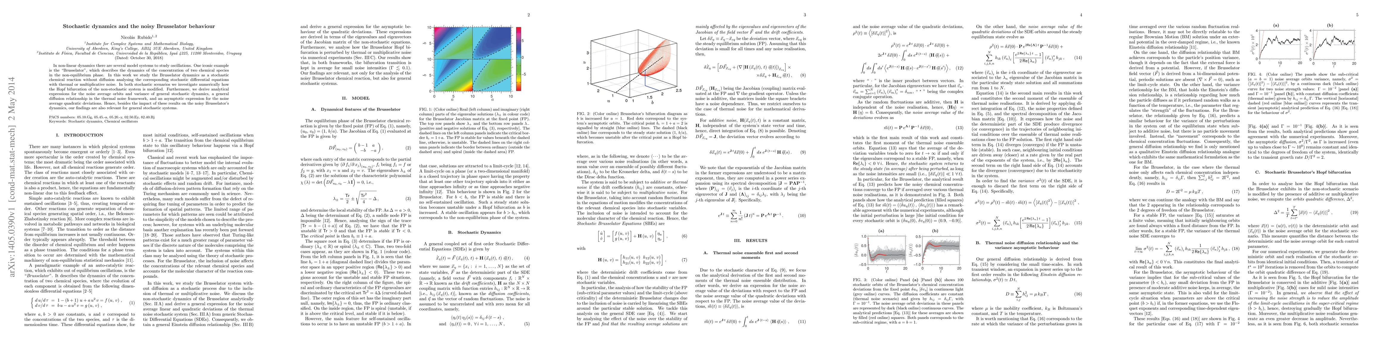 In non-linear dynamics there are several model systems to study oscillations. One iconic example is the "Brusselator", which describes the dynamics of the concentration of two chemical species in the non-equilibrium phase. In this work we study the Brusselator dynamics as a stochastic chemical reaction without diffusion analysing the corresponding stochastic differential equations with thermal or multiplicative noise. In both stochastic scenarios we investigate numerically how the Hopf bifurcation of the non-stochastic system is modified. Furthermore, we derive analytical expressions for the noise average orbits and variance of general stochastic dynamics, a general diffusion relationship in the thermal noise framework, and an asymptotic expression for the noise average quadratic deviations. Hence, besides the impact of these results on the noisy Brusselator's dynamics, our findings are also relevant for general stochastic systems.