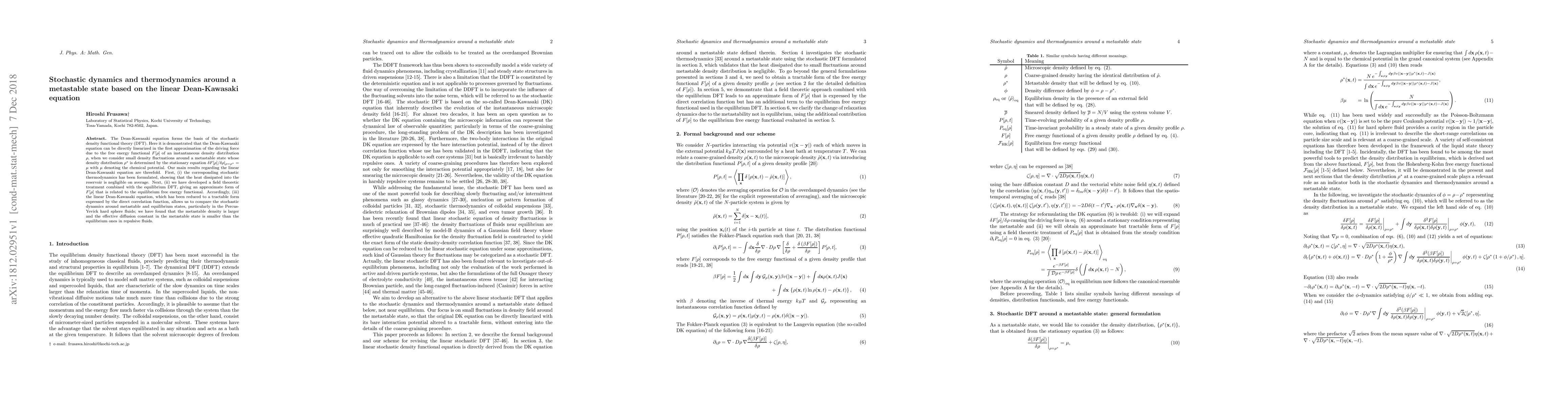 The Dean-Kawasaki equation forms the basis of the stochastic density functional theory (DFT). Here it is demonstrated that the Dean-Kawasaki equation can be directly linearized in the first approximation of the driving force due to the free energy functional $F[\rho] $ of an instantaneous density distribution $\rho$, when we consider small density fluctuations around a metastable state whose density distribution $\rho^*$ is determined by the stationary equation $\delta F[\rho]/\delta \rho|_{\rho=\rho^*}=\mu$ with $\mu$ denoting the chemical potential. Our main results regarding the linear Dean-Kawasaki equation are threefold. First, (i) the corresponding stochastic thermodynamics has been formulated, showing that the heat dissipated into the reservoir is negligible on average. Next, (ii) we have developed a field theoretic treatment combined with the equilibrium DFT, giving an approximate form of $F[\rho]$ that is related to the equilibrium free energy functional. Accordingly, (iii) the linear Dean-Kawasaki equation, which has been reduced to a tractable form expressed by the direct correlation function, allows us to compare the stochastic dynamics around metastable and equilibrium states, particularly in the Percus-Yevick hard sphere fluids; we have found that the metastable density is larger and the effective diffusion constant in the metastable state is smaller than the equilibrium ones in repulsive fluids.