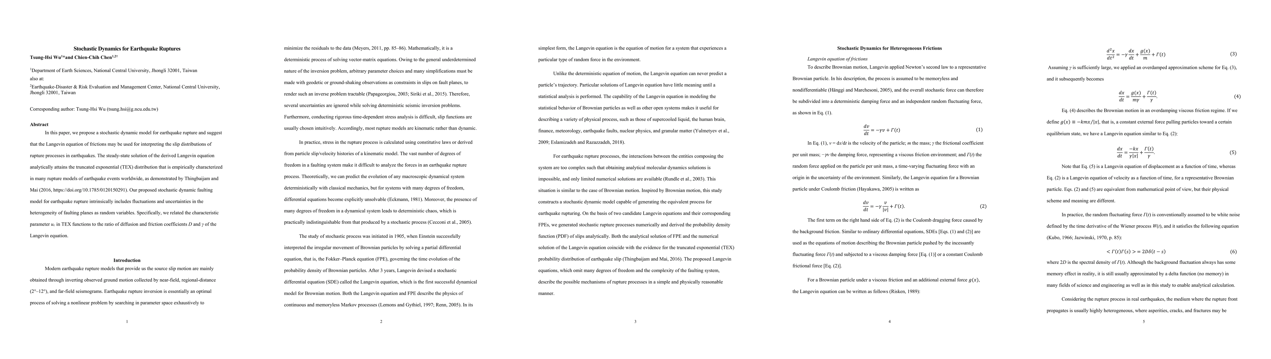 A new stochastic dynamic model for earthquake rupture uses the Langevin equation to describe slip distributions, achieving a match with empirical results from various rupture models.