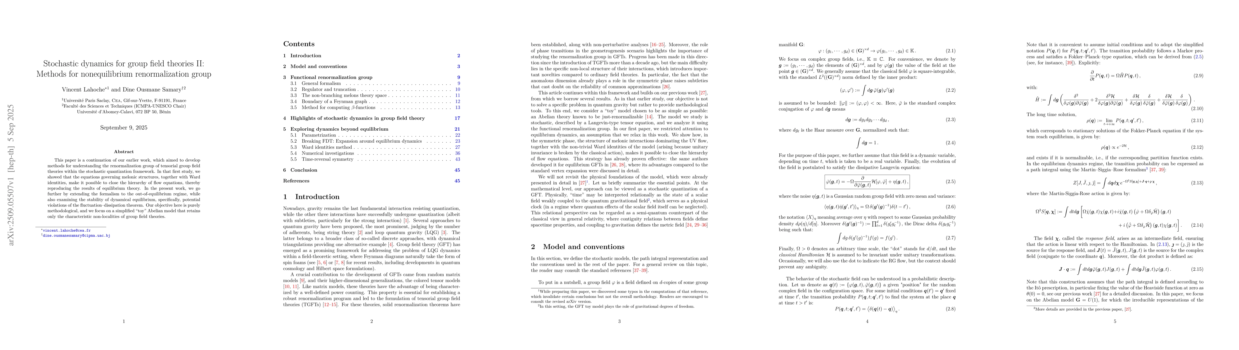 This paper is a continuation of our earlier work, which aimed to develop methods for understanding the renormalization group of tensorial group field theories within the stochastic quantization framework. In that first study, we showed that the equations governing melonic structures, together with Ward identities, make it possible to close the hierarchy of flow equations, thereby reproducing the results of equilibrium theory. In the present work, we go further by extending the formalism to the out-of-equilibrium regime, while also examining the stability of dynamical equilibrium, specifically, potential violations of the fluctuation-dissipation theorem. Our objective here is purely methodological, and we focus on a simplified ``toy'' Abelian model that retains only the characteristic non-localities of group field theories.
