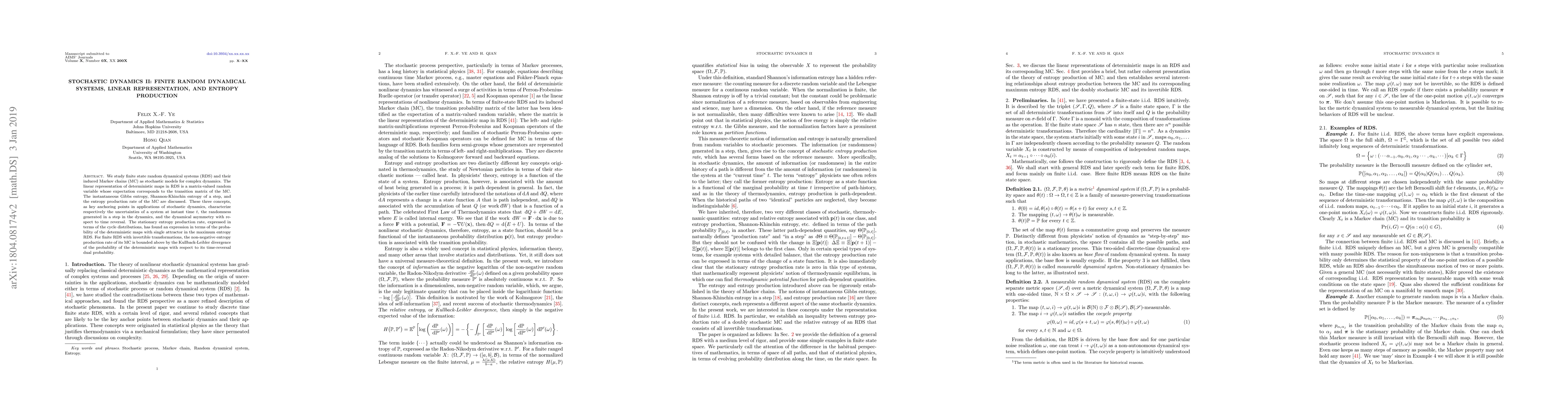We study finite state random dynamical systems (RDS) and their induced Markov chains (MC) as stochastic models for complex dynamics. The linear representation of deterministic maps in RDS are matrix-valued random variables whose expectations correspond to the transition matrix of the MC. The instantaneous Gibbs entropy, Shannon-Khinchin entropy per step, and the entropy production rate of the MC are discussed. These three concepts as key anchor points in stochastic dynamics, characterize respectively the uncertainties of the system at instant time $t$, the randomness generated per step, and the dynamical asymmetry with respect to time reversal. The entropy production rate, expressed in terms of the cycle distributions, has found an expression in terms of the probability of the deterministic maps with the single attractor in the maximum entropy RDS. For finite RDS with invertible transformations, the non-negative entropy production rate of its MC is bounded above by the Kullback-Leibler divergence of the probability of the deterministic maps with respect to its time-reversal dual probability.