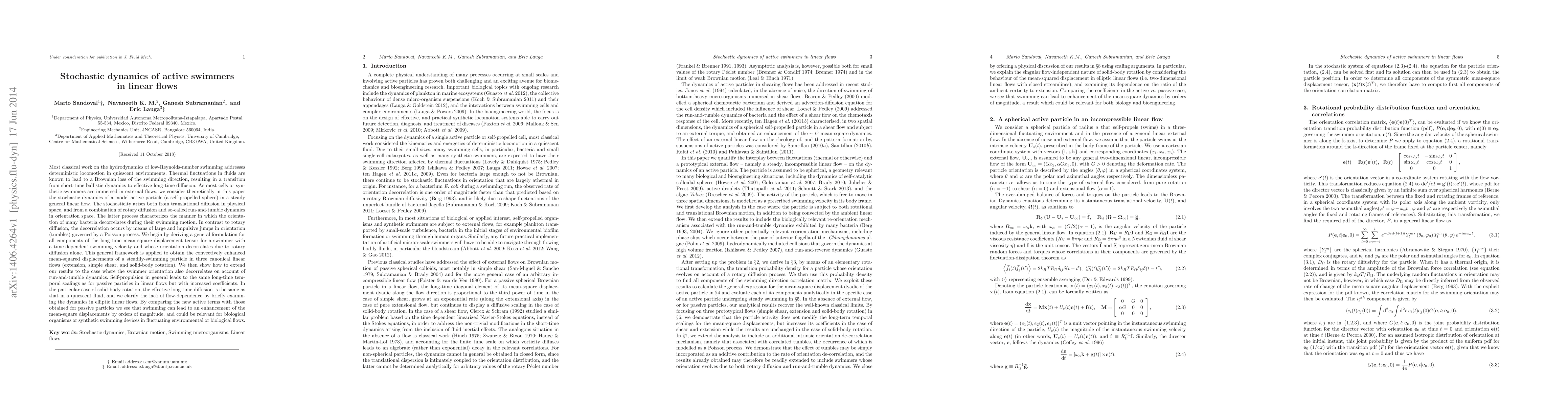 This paper investigates the stochastic dynamics of active swimmers in linear fluid flows, deriving a general framework for the mean square displacement tensor of self-propelled particles. It finds that active swimmers exhibit enhanced mean-square displacements compared to passive particles, especially in environments with external flows, which could have significant implications for biological and synthetic swimmers.