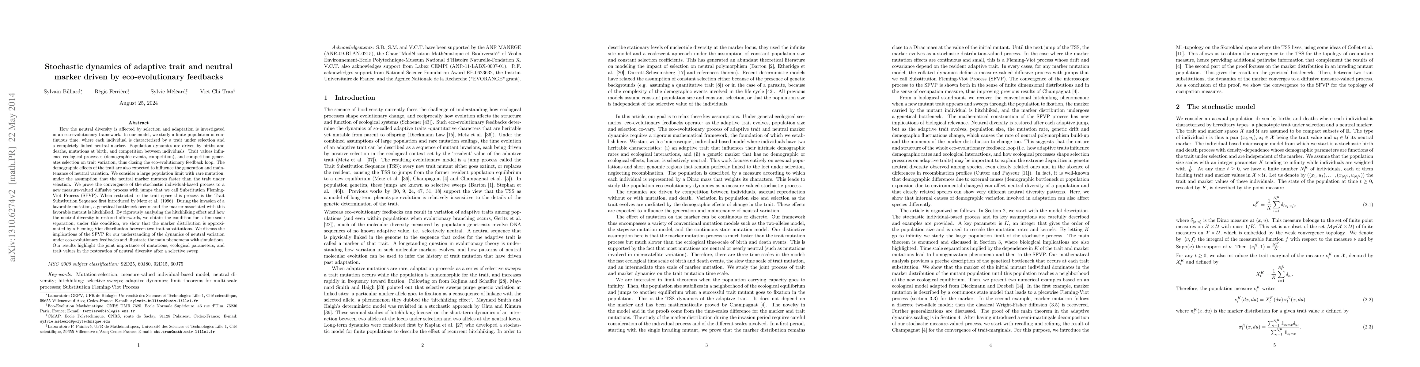 How the neutral diversity is affected by selection and adaptation is investigated in an eco-evolutionary framework. In our model, we study a finite population in continuous time, where each individual is characterized by a trait under selection and a completely linked neutral marker. Population dynamics are driven by births and deaths, mutations at birth, and competition between individuals. Trait values influence ecological processes (demographic events, competition), and competition generates selection on trait variation, thus closing the eco-evolutionary feedback loop. The demographic effects of the trait are also expected to influence the generation and maintenance of neutral variation. We consider a large population limit with rare mutation, under the assumption that the neutral marker mutates faster than the trait under selection. We prove the convergence of the stochastic individual-based process to a new measure-valued diffusive process with jumps that we call Substitution Fleming-Viot Process (SFVP). When restricted to the trait space this process is the Trait Substitution Sequence first introduced by Metz et al. (1996). During the invasion of a favorable mutation, a genetical bottleneck occurs and the marker associated with this favorable mutant is hitchhiked. By rigorously analysing the hitchhiking effect and how the neutral diversity is restored afterwards, we obtain the condition for a time-scale separation; under this condition, we show that the marker distribution is approximated by a Fleming-Viot distribution between two trait substitutions. We discuss the implications of the SFVP for our understanding of the dynamics of neutral variation under eco-evolutionary feedbacks and illustrate the main phenomena with simulations. Our results highlight the joint importance of mutations, ecological parameters, and trait values in the restoration of neutral diversity after a selective sweep.