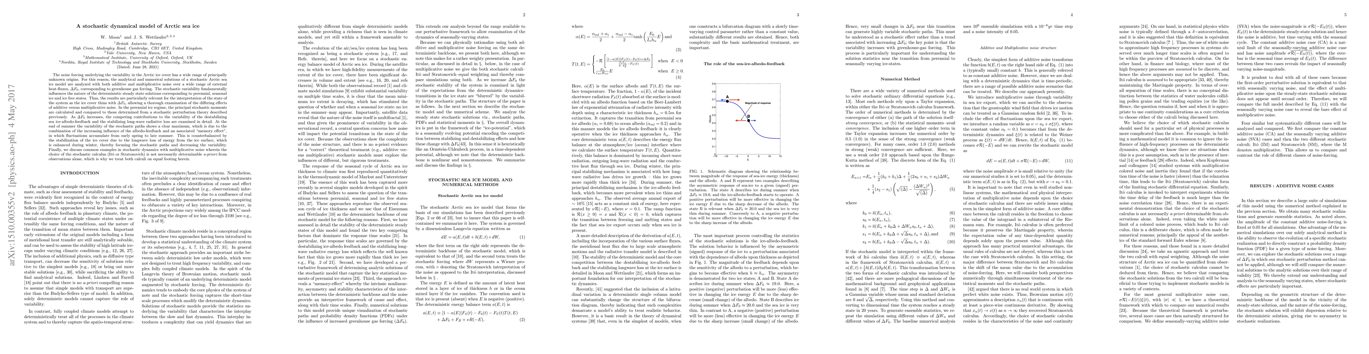 This paper investigates the stochastic dynamics of Arctic sea ice under additive noise, analyzing numerical solutions of a stochastic model to explore variability in perennial and seasonal ice states due to greenhouse gas forcing. It highlights the interplay between destabilizing albedo feedback and stabilizing long-wave radiative loss, showing a peak in summer variability due to accumulated memory effects, while winter variability decreases due to enhanced energy loss.